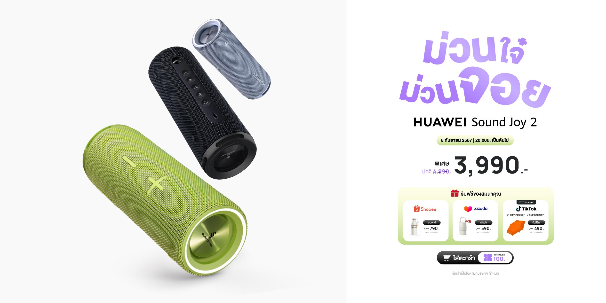 HUAWEI Sound Joy 2 วางจำหน่ายในราคาพิเศษเพียง 3,990 บาท จากราคาปกติ 4,990 บาท พร้อมแถมฟรี! ร่ม (สีส้ม) มูลค่า 490 บาท สำหรับ 150 ออเดอร์แรก ที่ TikTok Shop และสำหรับลูกค้าที่สั่งซื้อที่ร้านค้าอย่างเป็นทางการของหัวเว่ยบน Lazada รับฟรี แก้วน้ำ มูลค่า 590 บาท (สำหรับ 120 ออเดอร์แรก) และร้านค้าอย่างเป็นทางการของหัวเว่ยบน Shopee รับฟรี กระบอกน้ำ มูลค่า 790 บาท (สำหรับ 100 ออเดอร์แรก) ตั้งแต่ 8 กันยายน 2567 เวลา 20.00 น. เป็นต้นไป