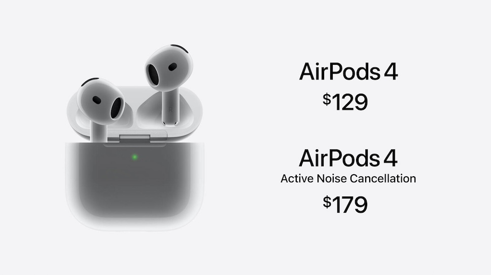Apple แทนที่ AirPods 2 และ 3 ด้วยการเปิดตัว AirPods 4 โดยทำออกมาให้เลือก 2 รุ่น เริ่มต้นที่ราคา 129 ดอลลาร์สหรัฐ หรือราว 4,390 บาท อีกตัวเลือกมาในราคา 179 ดอลลาร์สหรัฐ หรือราว 6,090 บาท ซึ่งเหนือกว่าที่รองรับ Active Noise Cancellation