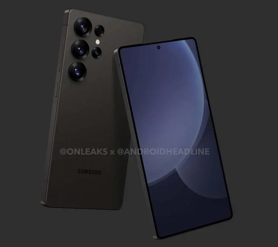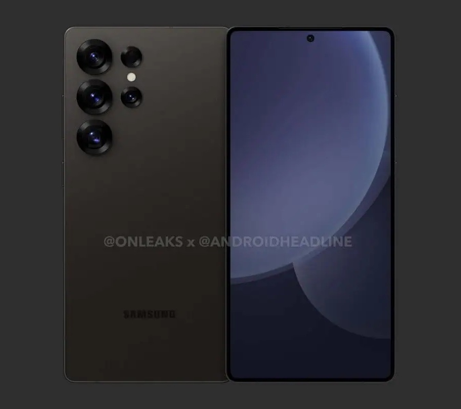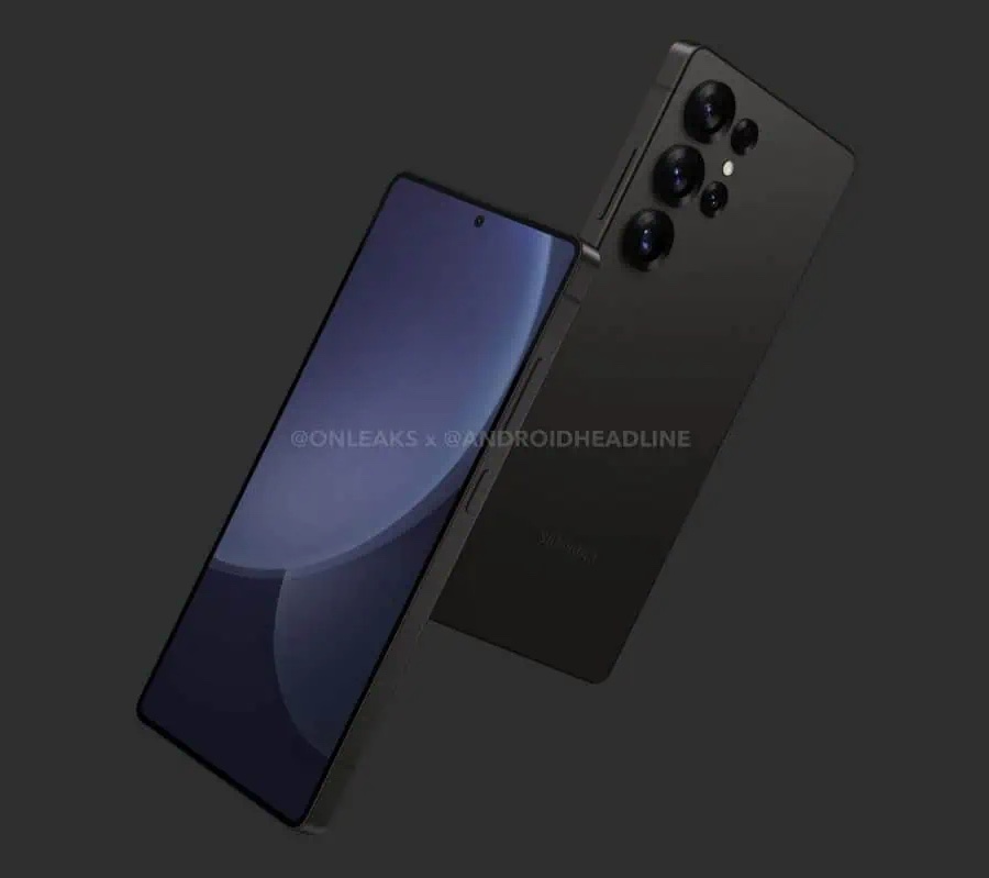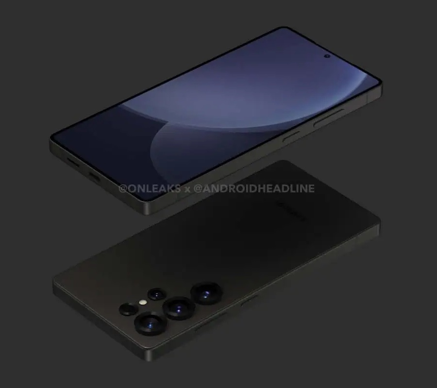 จากภาพเรนเดอร์จะเห็นว่า Samsung Galaxy S25 Ultra มีดีไซน์แบนราบ กรอบตัวเครื่องเป็นโลหะประกบหน้า-หลังด้วยแผงกระจก ขอบมุมโค้งมน ติดกล้องเซลฟี่ไว้ใหลุมบนหน้าจอ ขณะที่ดีไซน์กล้องหลังยังดูคล้ายกับ Galaxy S24 Ultra ในปัจจุบัน
