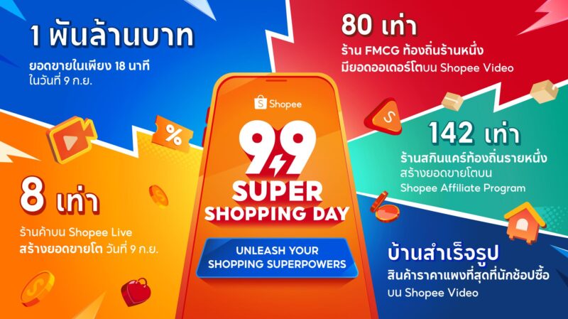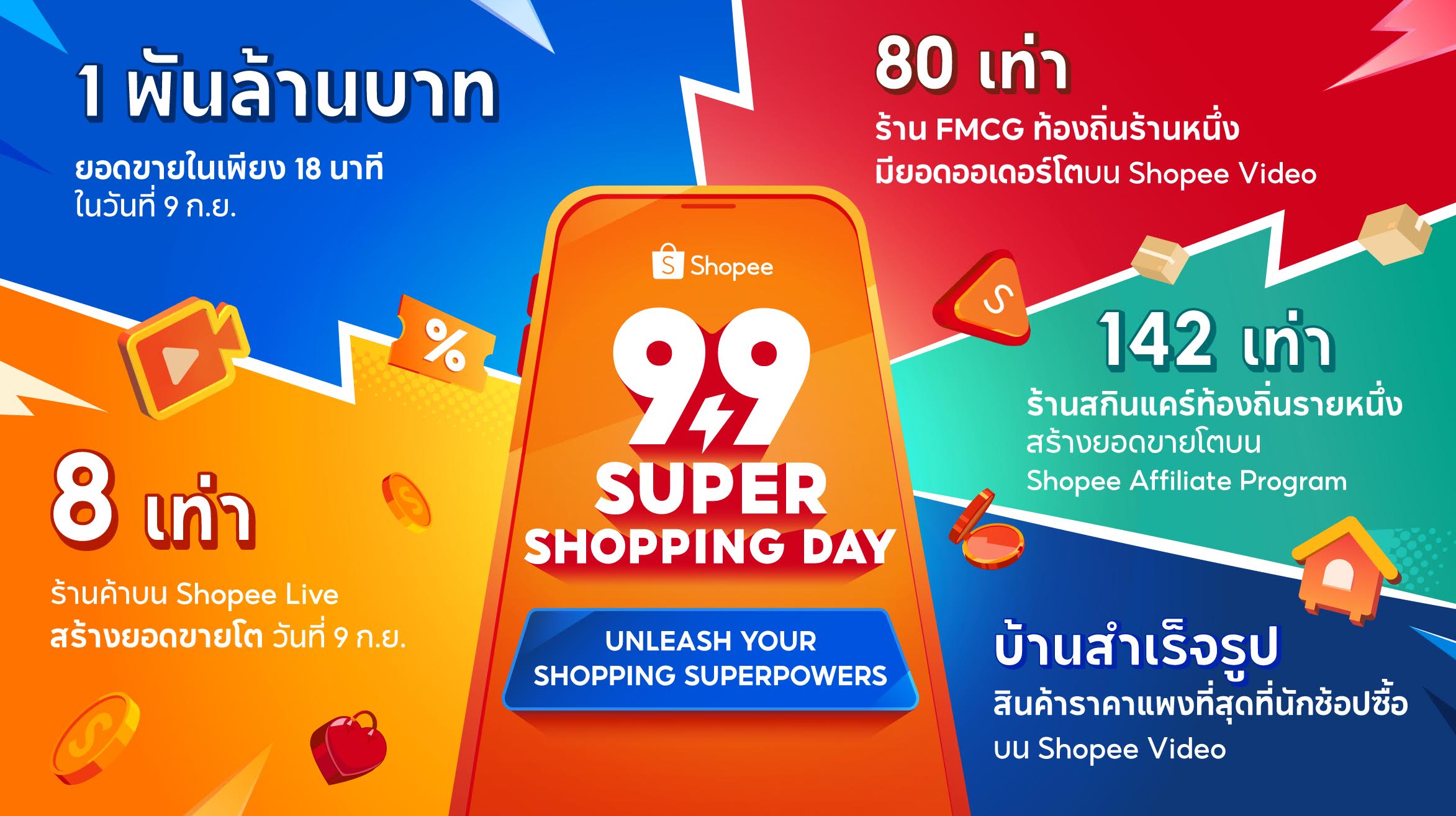 ช้อปปี้ อีคอมเมิร์ซเบอร์ 1 ที่ครองใจผู้ใช้งานในประเทศไทย ฉลองความสำเร็จปีที่ 9 กับการเป็นผู้ริเริ่มแคมเปญดับเบิ้ลเดท ‘9.9’ ซิกเนเจอร์แคมเปญที่คนไทยรู้จักกันดี เรามุ่งมั่นตอบสนองความต้องการและพัฒนาแอปพลิเคชันของเราให้สอดคล้องกับพฤติกรรมผู้ใช้งานในทุกกลุ่ม ทำให้ช้อปปี้กลายเป็นแอปพลิเคชันยอดนิยมที่เติบโตอย่างต่อเนื่อง พร้อม มุ่งเน้นการมอบประสบการณ์ช้อปปิ้งออนไลน์ที่ดีที่สุดให้แก่ผู้ใช้งานทุกกลุ่ม ไม่ว่าจะเป็นผู้ซื้อ ผู้ขาย หรือเหล่าครีเอเตอร์นักสร้างสรรค์บนแพลตฟอร์ม Shopee 9.9 Super Shopping Day มีส่วนสนับสนุนการเติบโตและความยั่งยืนของพันธมิตรแบรนด์ ภาคธุรกิจ และผู้ประกอบการชาวไทยอย่างมาก
