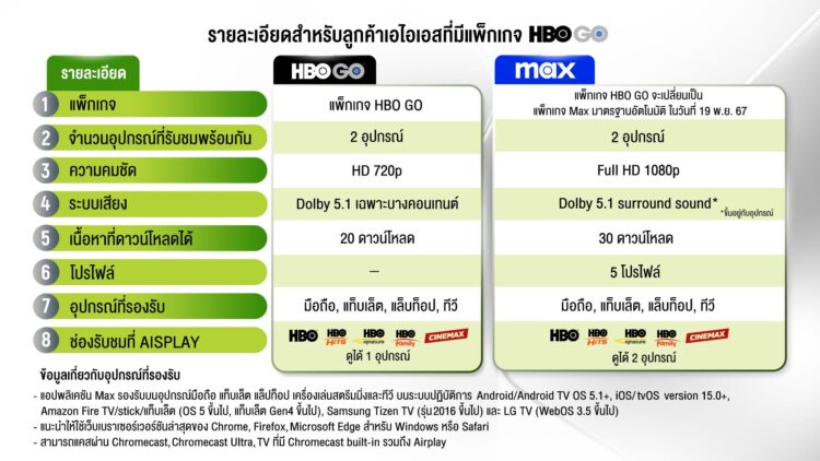 ตั้งแต่วันที่ 19 พฤศจิกายน 2567 เป็นต้นไป สิทธิ์การใช้งาน HBO GO ของลูกค้า AIS จะเปลี่ยนเป็นสิทธิ์การใช้งาน แพ็กเกจ Max มาตรฐาน (Max Standard) ลูกค้าจะได้รับประสบการณ์การสตรีมที่เหนือระดับบน Max ด้วยอินเทอร์เฟซที่ใช้งานง่าย รวมถึงคำแนะนำรายการส่วนบุคคล การค้นหาที่ราบรื่น หมวดหมู่ตามประเภทรายการ และศูนย์รวมแบรนด์ แพ็กเกจมาตรฐานของ Max รองรับการสตรีมพร้อมกันบนอุปกรณ์สองเครื่องในครั้งเดียว และสามารถรับชมบนอุปกรณ์ที่หลากหลายขึ้นรวมถึงทีวี นอกจากนี้ลูกค้ายังสามารถดาวน์โหลดคอนเทนต์ได้สูงสุดถึง 30 รายการเพื่อรับชมได้ทุกที่ทุกเวลา