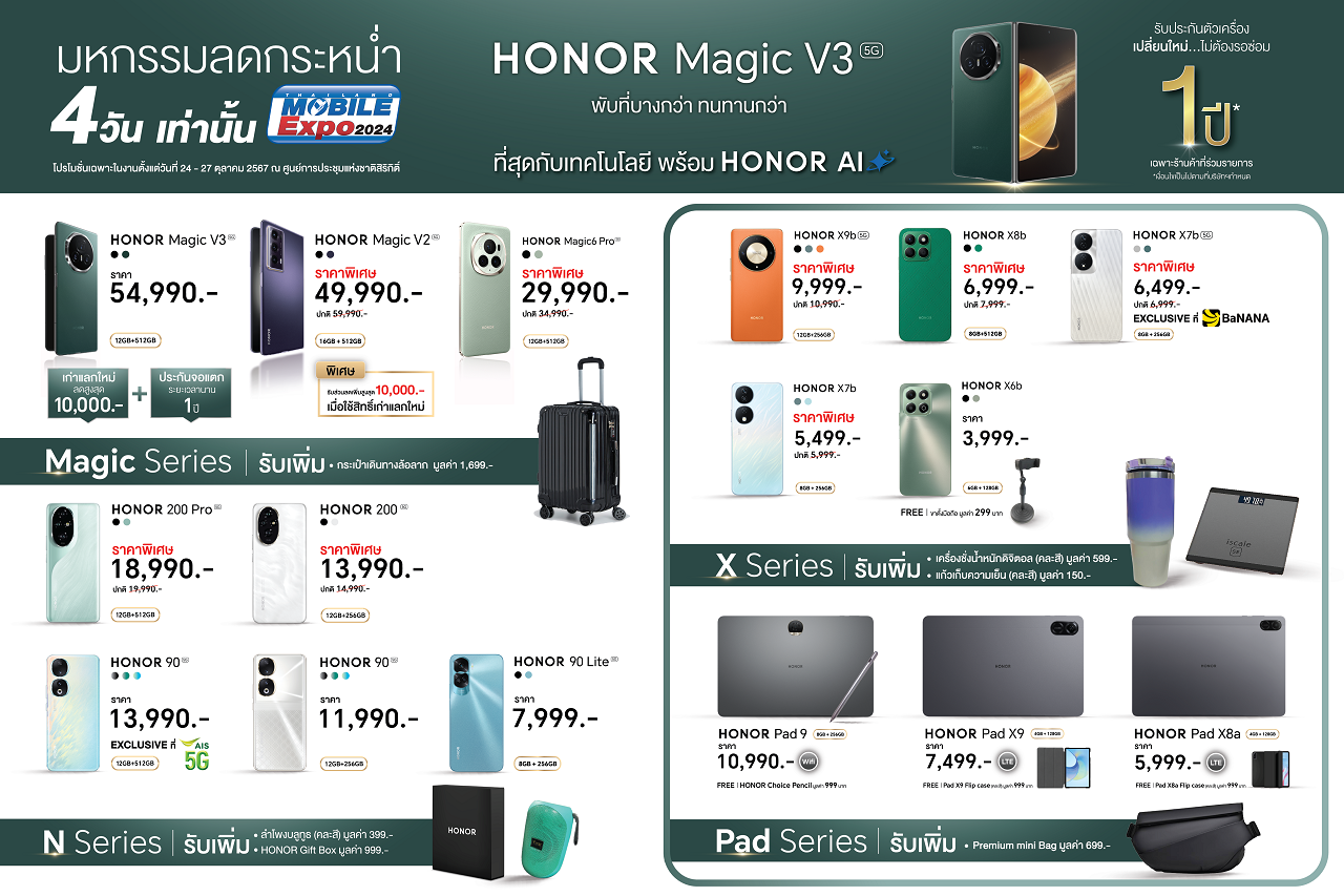 ออเนอร์ (HONOR) ผู้ให้บริการอุปกรณ์อัจฉริยะชั้นนำระดับโลก ยกขบวนพาเหรดสมาร์ตโฟนหลากหลายรุ่นยอดนิยมและแท็บเล็ตน่าใช้ อาทิ Magic Series, N Series, X Series และ Pad Series จัดโปรโมชันและมอบสิทธิประโยชน์ พร้อมของแถมสุดพิเศษมากมาย เอาใจลูกค้าในงานมหกรรมมือถือที่ใหญ่ที่สุดของประเทศThailand Mobile Expo 2024ระหว่างวันที่ 24 – 27 ตุลาคม 2567 ณ ศูนย์ประชุมแห่งชาติสิริกิติ์