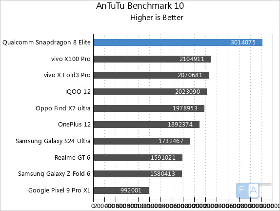 ผลการทดสอบจากแอป AnTuTu 10 พบว่าชิป Snapdragon 8 Elite ทำได้ถึง 3,014,075 คะแนน แซงหน้า Snapdragon 8 Gen 3 ทำ ใน vivo X100 Pro ที่ทำได้ 2.1 ล้านคะแนน ขณะที่ชิป Dimensity 9400 ใน vivo X200 Pro ซึ่งทำได้ 2.99 ล้านคะแนน