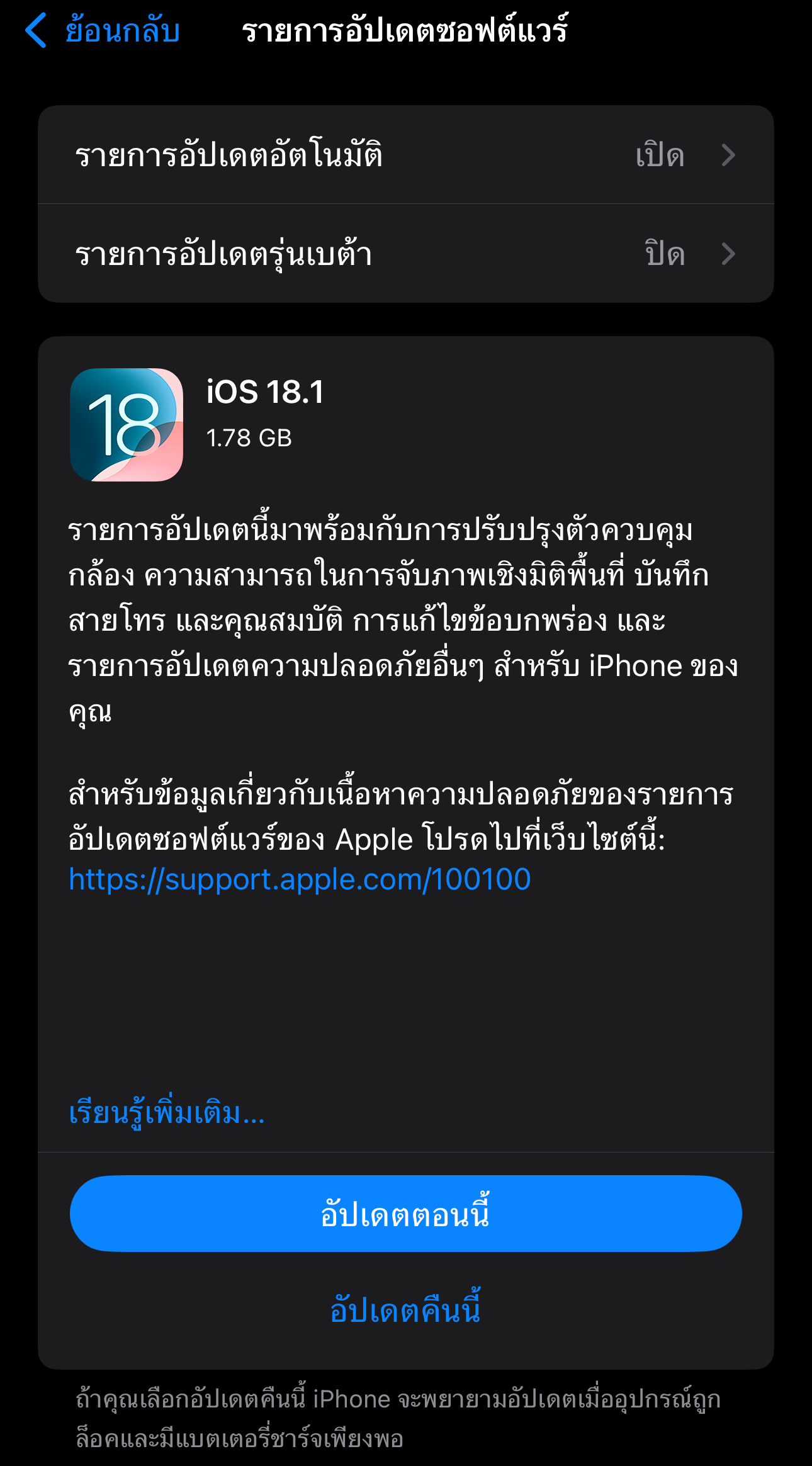 บางคุณสมบัติอาจไม่มีในทุกภูมิภาคหรือบนอุปกรณ์ทุกเครื่องของ Apple สำหรับข้อมูลเกี่ยวกับเนื้อหาความปลอดภัยของรายการอัปเดตซอฟต์แวร์ของ Apple โปรดไปที่เว็บไซต์นี้: