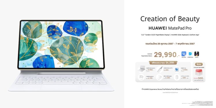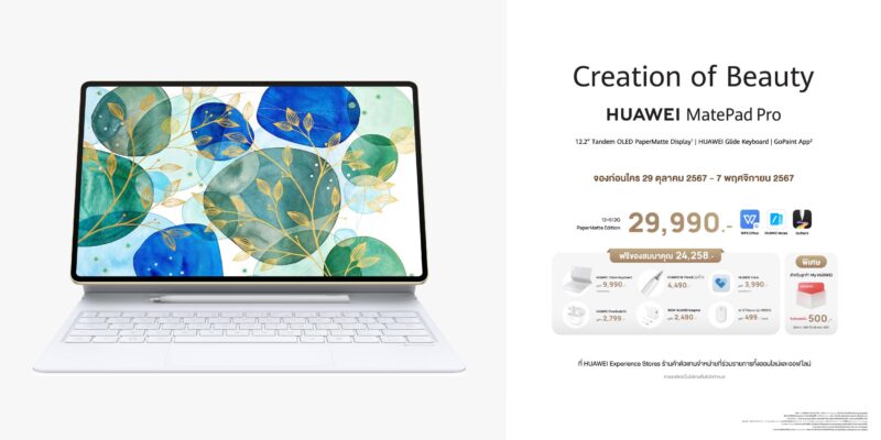 พรีออเดอร์ได้แล้ววันนี้ HUAWEI MatePad Pro 12.2 ในราคาเพียง 29,990 บาท ตั้งแต่วันที่ 29 ตุลาคม 2567 – 7 พฤศจิกายน 2567 รับฟรีทันทีของสมนาคุณมูลค่าสูงสุด 24,258 บาท ได้แก่ HUAWEI Glide Keyboard มูลค่า 9,990 บาท HUAWEI M-Pencil รุ่นที่ 3 มูลค่า 4,490 บาท HUAWEI Care ดูแลหน้าจอ มูลค่า 3,990 บาท 100W HUAWEI Adapter มูลค่า 2,490 บาท HUAWEI FreeBuds 5i มูลค่า 2,799 บาท และ เมาส์ Rapoo รุ่น M650S มูลค่า 499 บาท ที่ HUAWEI Experience Storeและร้านค้าที่ร่วมรายการ รวมทั้งช่องทางออนไลน์ HUAWEI Store และร้านค้าอย่างเป็นทางการของหัวเว่ยบนแพลตฟอร์ม Lazada, Shopee และ TikTok Shop