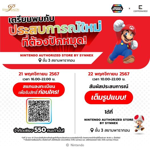 สนุกกับเกมสุดมันส์ ที่ให้ทดลองเล่นถึง 5 Stations พร้อมช้อปของสะสมสุดพิเศษ ทั้งแผ่นเกม, ตุ๊กตา และอีกมากมาย พบกันที่ Nintendo Authorized Store by Synnex โดย วันที่ 21 พฤศจิกายน 2567 เวลา 16.00 – 22.00 น. เปิดให้บริการเฉพาะลูกค้าที่ลงทะเบียนล่วงหน้าเท่านั้น และ วันที่ 22 พ.ย. 67 เปิดให้บริการอย่างเป็นทางการสำหรับลูกค้าทั่วไป ตั้งแต่ 10.00 น. เป็นต้นไป เงื่อนไขการเข้าร่วมกิจกรรมเป็นไปตามที่บริษัท ซินเน็ค (ประเทศไทย) จำกัด (มหาชน) และบริษัท คอปเปอร์ ไวร์ด จำกัด (มหาชน) กำหนด