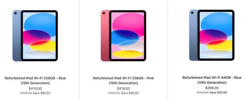 iPad 10 ที่ผ่านการ Refurbished เป็นเวอร์ชัน Wi-Fi เริ่มต้นที่ 299 ดอลลาร์สหรัฐ หรือราว 10,390 บาท สำหรับรุ่น 64GB (ถูกกว่าราคาปกติ 50 ดอลลาร์สหรัฐ หรือราว 1,790 บาท) ขณะที่รุ่น 256GB มีราคา 419 ดอลลาร์สหรัฐ หรือราว 14,490 บาท (ถูกกว่าราคาปกติ 80 ดอลลาร์สหรัฐ หรือราว 2,790 บาท)