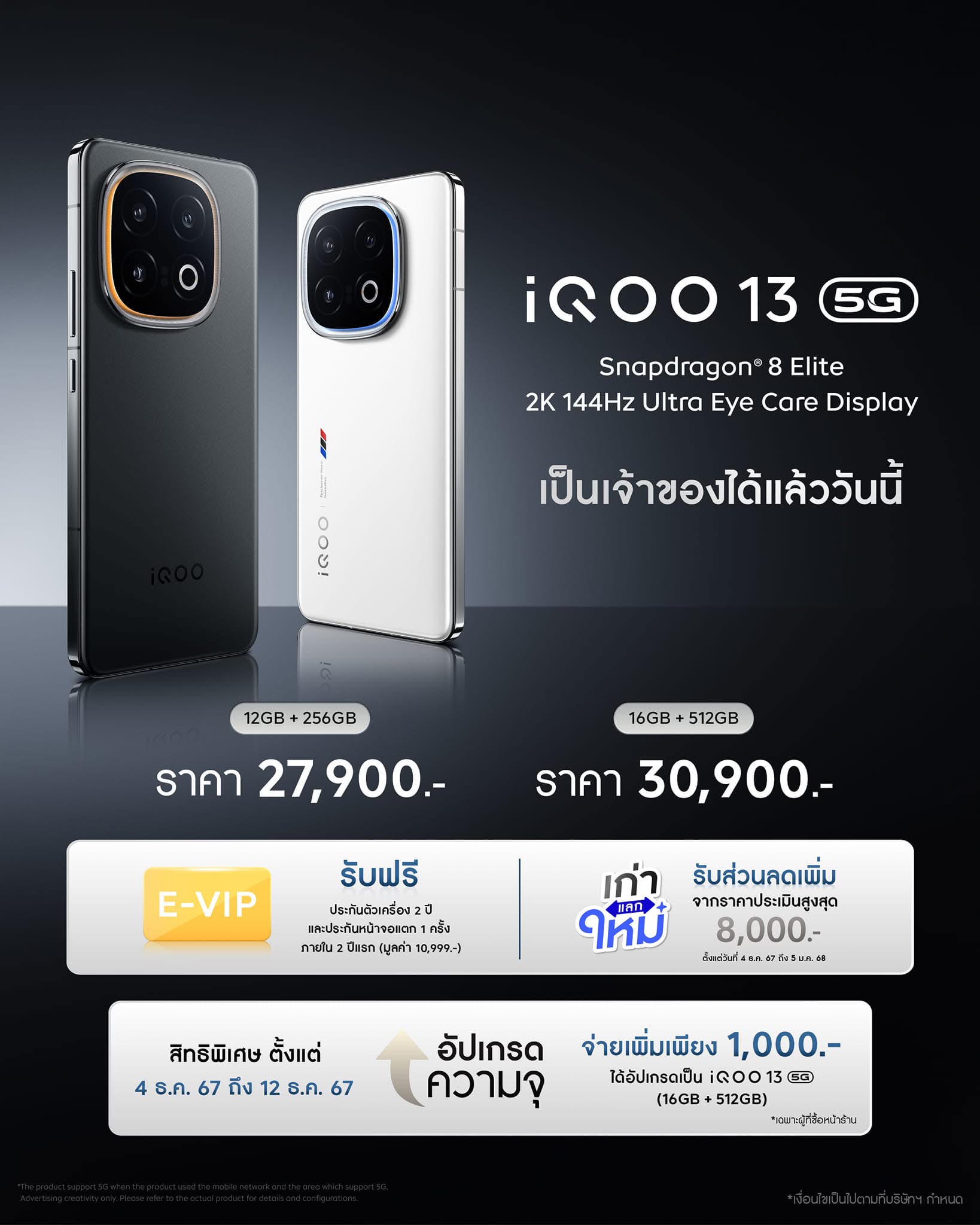 iQOO (ไอคูล) แบรนด์สมาร์ตโฟนตัวท็อป ประกาศเปิดตัว iQOO 13 5G สมาร์ตโฟนรุ่นใหม่ล่าสุดอย่างเป็นทางการในประเทศไทยภายใต้แนวคิด‘เปิดประสบการณ์ ที่เหนือกว่า’ หรือ‘Unlocking New Experiences’ ยกระดับมาตรฐานใหม่ของสมาร์ตโฟนประสิทธิภาพสูงผสานความร่วมมือกับ Qualcomm โดยใช้พลังของชิปเซ็ต Snapdragon® 8 Elite ที่ได้รับการปรับแต่งพิเศษเพื่อมอบการตอบสนองที่ทั้งเสถียร และรวดเร็วเหนือชั้น สามารถทำงานหลายอย่างพร้อมกันอย่างราบรื่น ไปจนถึงเปิดประสบการณ์การเล่นเกมและการถ่ายภาพที่เหนือกว่า ตอบโจทย์ความต้องการของผู้หลงใหลเทคโนโลยี เหล่าเกมเมอร์ และผู้ใช้งานทุกคน