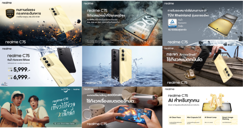 รับฟรี realme C75 Bag และประกันจอแตก 1 ปี รวมมูลค่า 2,698 บาท ทั้ง 3 ช่องทางดังกล่าวนอกจากนี้ realme ยังผนึกกำลังกับการท่องเที่ยวแห่งประเทศไทย (ททท.) และ เลิกลั่ก อินฟลูเอนเซอร์ชื่อดัง เปิดประสบการณ์มือถือสุดแกร่ง “realme C75 เที่ยวไร้กังวล” โดยนำ realme C75 ออกไปตะลุยถ่ายทำคอนเทนต์ตามแหล่งท่องเที่ยวชื่อดัง ณ จังหวัดกาญจนบุรี เพื่อพิสูจน์คุณสมบัติทนน้ำ-ทนฝุ่นในทุกสถานการณ์ พร้อมอวดความสามารถของฟีเจอร์ AI แบบจัดเต็ม! เพื่อตอกย้ำว่า realme C75 เป็นสมาร์ตโฟนสำหรับสายแกร่งตัวจริง!