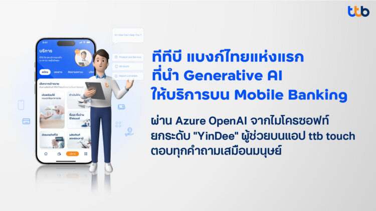 ทีเอ็มบีธนชาต หรือ ทีทีบี มุ่งขับเคลื่อนองค์กรด้วย Digital Transformation โชว์ความสำเร็จการพัฒนาผู้ช่วยบนมือถือ “ยินดี-Yindee” เวอร์ชันใหม่ ถือเป็นธนาคารไทยแห่งแรกที่นำ Generative AI ผ่าน Microsoft Azure OpenAI มาใช้ในการตอบคำถามช่วยเหลือลูกค้าผ่านโมบายแบงก์กิ้ง (Mobile Banking) ยกระดับประสบการณ์ทางการเงิน เพิ่มความสะดวก-รวดเร็ว ตอบคำถามได้ตลอด 24 ชั่วโมง เผยผู้ใช้ Yindee ตลอด 1 ปี พุ่งสูงกว่า 1 ล้านครั้ง