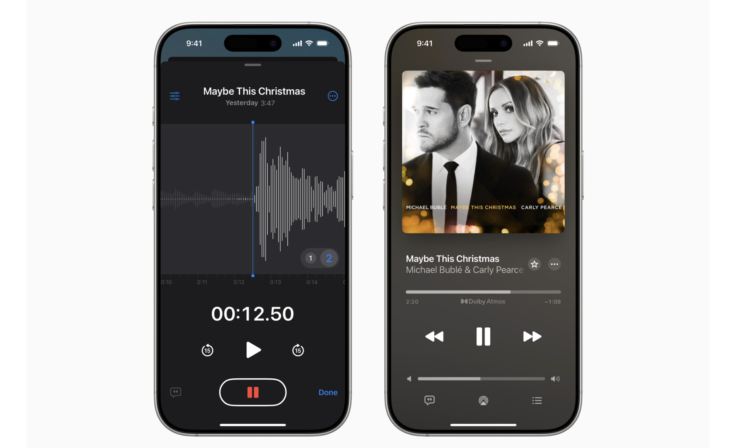 ผู้ชนะรางวัล GRAMMY Award ทั้ง 3 ราย ได้แก่ Michael Bublé นักร้องระดับมัลติแพลตตินั่ม, Carly Pearce นักร้องแนวคันทรี่ชื่อดัง และ Greg Wells โปรดิวเซอร์เพลงร่วมมือกันเพื่อทำให้เพลงใหม่ของพวกเขา “Maybe This Christmas” เป็นจริงได้ด้วยแอปเสียงบันทึกบน iPhone 16 Pro โดยในวิดีโอเบื้องหลัง ศิลปินทั้งสามได้แบ่งปันแรงบันดาลใจสำหรับเพลงวันหยุดอันทรงพลังของพวกเขา และให้รายละเอียดว่าคุณสมบัติแอปเสียงบันทึกใหม่ช่วยให้พวกเขาบันทึกเสียงร้องโดยใช้แค่ iPhone 16 Pro เพียงอย่างเดียวได้อย่างไร