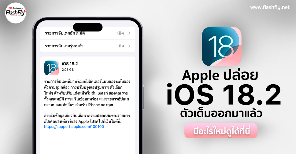 ในที่สุด Apple ก็ปล่อย iOS 18.2 และ iPadOS 18.2 ตัวเต็มออกมาให้ผู้ใช้งานทั่วไปได้ใช้งานแล้ว โดยการอัปเดตนี้มาพร้อมกับชัตเตอร์แบบสองระดับของตัวควบคุมกล้อง การปรับปรุงแอปรูปภาพ ตัวเลือกใหม่ๆ สำหรับปรับแต่งหน้าเริ่มต้น Safari ของคุณ รวมทั้งคุณสมบัติ การแก้ไขข้อบกพร่อง และรายการอัปเดตความปลอดภัยอื่นๆ สำหรับ iPhone และ iPad สำหรับประเทศไทยยังไม่รองรับการใช้งาน Apple Intelligence ทางการ แต่สามารถใช้งานได้หากเปลี่ยนภาษาและภูมิภาคเป็นอเมริกา