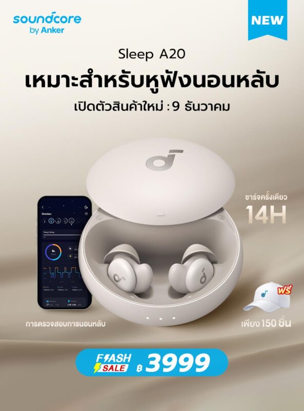 Sleep A20 หูฟังที่ออกแบบมาเพื่อการนอนหลับที่เงียบสงบ ผสมผสานระบบปิดเสียงรบกวน 4 จุดเข้ากับการออกแบบตามหลักสรีรศาสตร์ที่เหมาะสำหรับผู้ที่นอนตะแคง ระยะเวลาการใช้งานสูงสุด 14 ชั่วโมงต่อการชาร์จหนึ่งครั้ง และ 80 ชั่วโมงเมื่อใช้ร่วมกับเคสชาร์จ เพื่อการนอนหลับที่ต่อเนื่องไม่ขาดตอน Sleep A20 จำหน่ายในสีขาวคลาสสิก ในวันที่ 9 ธันวาคม บน Shopee และร้านค้าตัวแทนจำหน่ายที่ได้รับการคัดเลือก ราคา 3,999 บาท