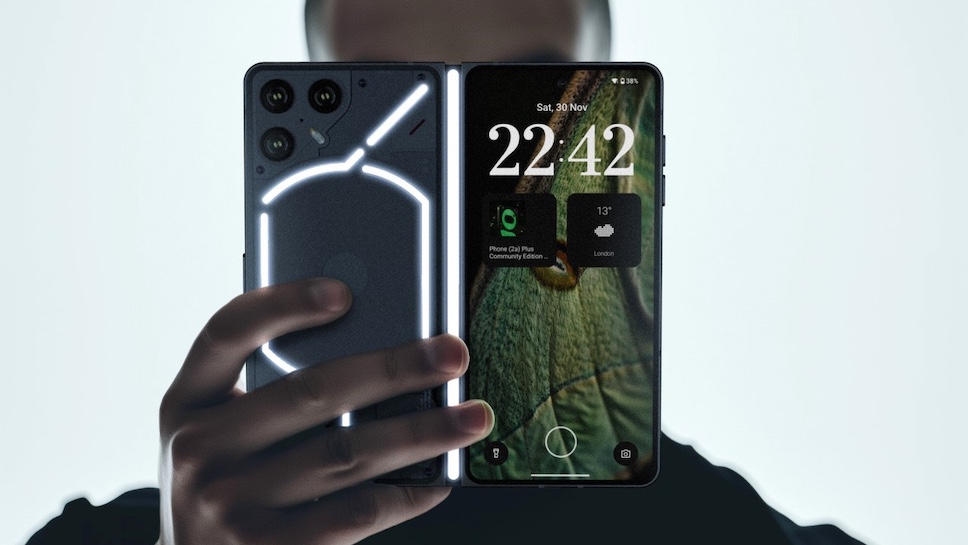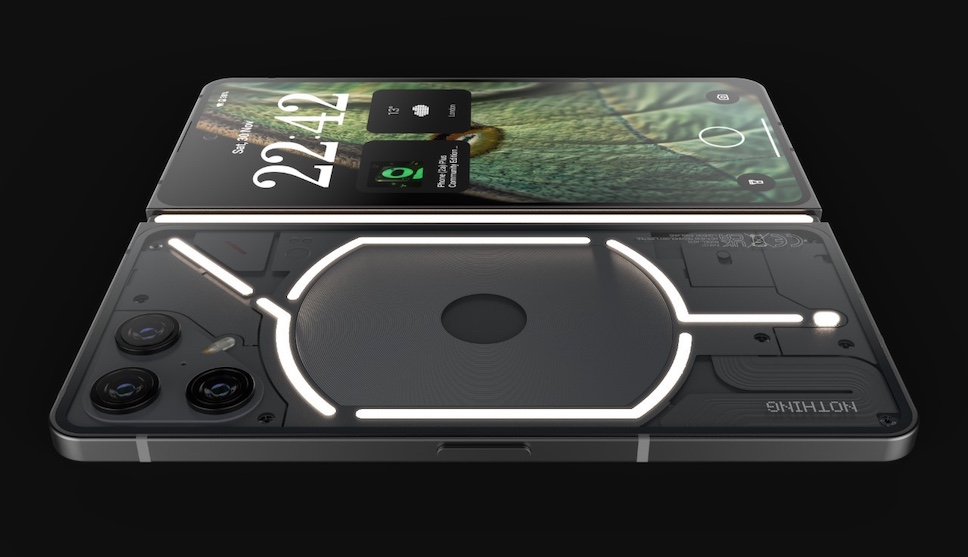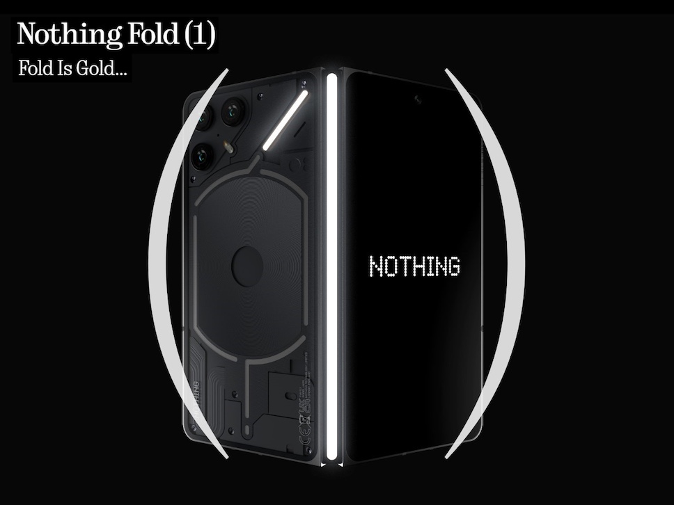 Nothing Fold (1) เป็นคอนเซ็ปต์สมาร์ทโฟนจอพับได้ในแนวตั้ง สไตล์เดียวกับ OPPO Find N3 หรือ Galaxy Z Fold6 แต่มีความโดดเด่นที่ดีไซน์อันเป็นเอกลักษณ์ของแบรนด์ Nothing นั่นคืออินเทอร์เฟซ Glyph ที่ฝังอยู่ในตัวเครื่องแบบโปร่งใส เพื่อแสดงสีสันตามฟังก์ชันการใช้งานที่ตั้งค่าไว้ อีกทั้งยังติดตั้งอินเทอร์เฟซ Glyph ไว้บนบานพับด้วย และควบคุมการใช้งานด้วย Nothing OS 3