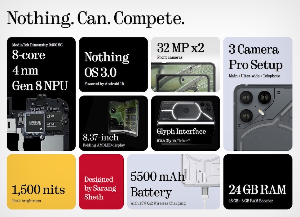 ผู้สร้างคอนเซ็ปต์ หวังว่า Nothing Fold (1) จะมาพร้อมจอแสดงผลหลักที่พับได้ขนาด 8.37 นิ้ว จอด้านนอก 6.5 นิ้ว ใช้ชิปประมวลผล MediaTek Dimensity 9400 5G ความจุแบตเตอรี่ 5,500mAh มีกล้องหลัง 3 ตัว และกล้องหน้า 2 ตัว (บนจอหลักและจอด้านนอก)