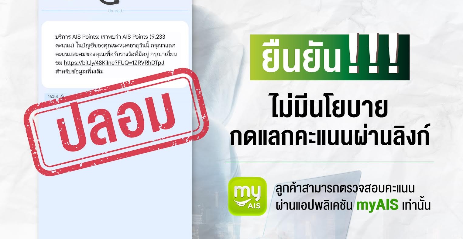 AIS ขอยืนยันว่า ไม่มีนโยบายการกดแลกคะแนน AIS Points ผ่านลิงก์ การตรวจสอบหรือแลกคะแนนสะสม AIS Points ต้องดำเนินการผ่านแอปพลิเคชัน myAIS เท่านั้น