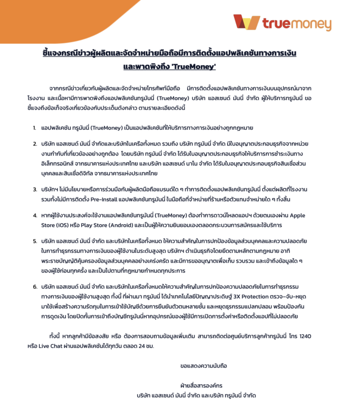 จากกรณีข่าวเกี่ยวกับผู้ผลิตและจัดจำหน่ายโทรศัพท์มือถือ มีการติดตั้งแอปพลิเคชันทางการเงินบนอุปกรณ์มาจากโรงงาน และเนื้อหามีการพาดพิงถึงแอปพลิเคชันทรูมันนี่ (TrueMoney) บริษัท แอสเซนด์ มันนี่ จำกัดผู้ให้บริการทรูมันนี่ ขอชี้แจงถึงข้อเท็จจริงเกี่ยวข้องกับประเด็นดังกล่าว ตามรายละเอียดดังนี้