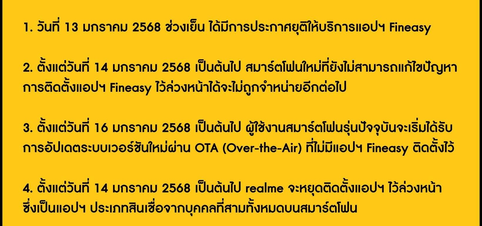 - ตั้งแต่วันที่ 14 มกราคม 2568 เป็นต้นไป สมาร์ตโฟนใหม่ที่ยังไม่สามารถแก้ไขปัญหาการติดตั้งแอปฯ Fineasy ไว้ล่วงหน้าได้จะไม่ถูกจำหน่ายอีกต่อไป
