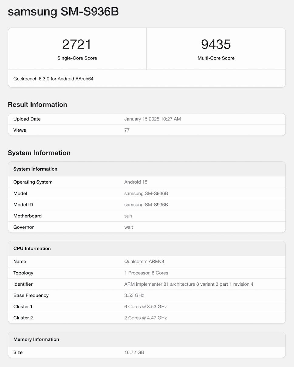 Samsung Galaxy S25+ (SM-S936B) เข้ามาทดสอบประสิทธิภาพบนแอป Geekbench ล่าสุดเมื่อวันที่ 15 มกราคมที่ผ่านมา ซึ่งพบว่าใช้ชิปประมวลผล Snapdragon 8 Elite ความจำ RAM 12GB และทำงานบน Android 15 ได้รับ 2,721 คะแนน จากการทดสอบ Single-Core และ 9,435 คะแนน สำหรับ Multi-Core