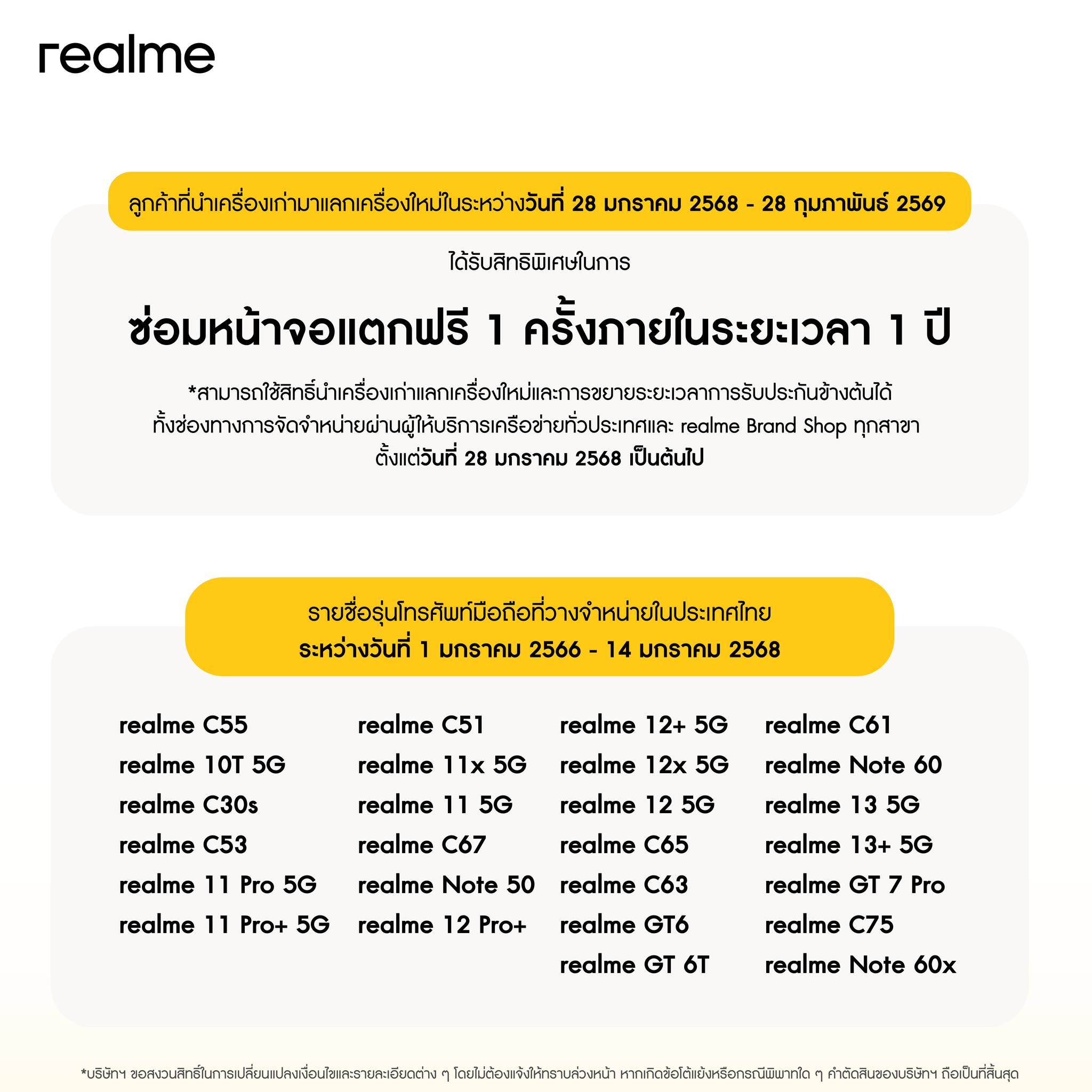 2.3 ลูกค้าสามารถใช้สิทธิ์นำเครื่องเก่าแลกเครื่องใหม่และการขยายระยะเวลาการรับประกันข้างต้นได้ ทั้งช่องทางการจัดจำหน่ายผ่านผู้ให้บริการเครือข่ายทั่วประเทศและ realme Brand Shop ทุกสาขา ตั้งแต่วันที่ 28 มกราคม 2568 เป็นต้นไป