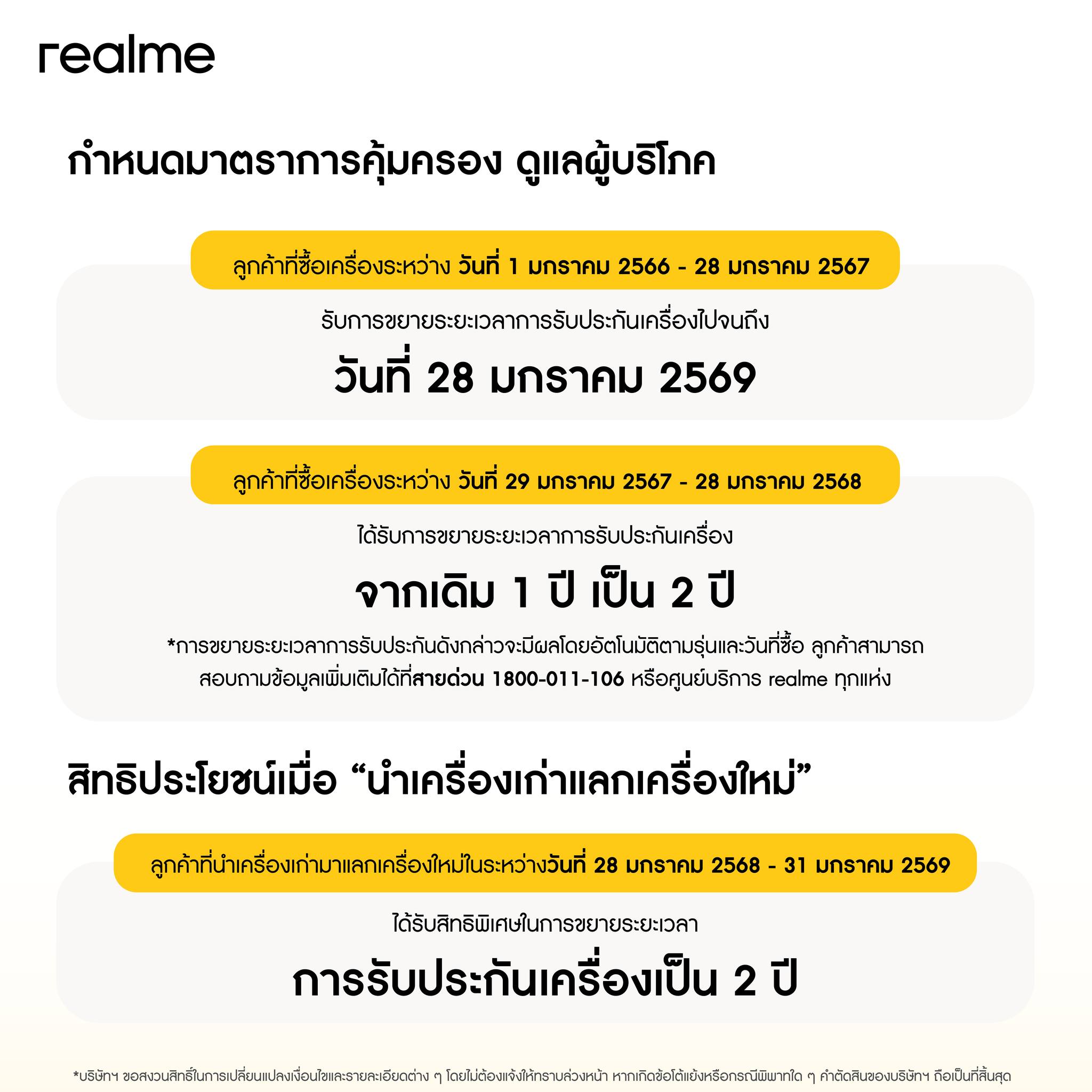 1.3 การขยายระยะเวลาการรับประกันดังกล่าวจะมีผลโดยอัตโนมัติตามรุ่นและวันที่ซื้อ ลูกค้าสามารถสอบถามข้อมูลเพิ่มเติมได้ที่สายด่วน 1800-011-106 หรือศูนย์บริการ realme ทุกแห่ง