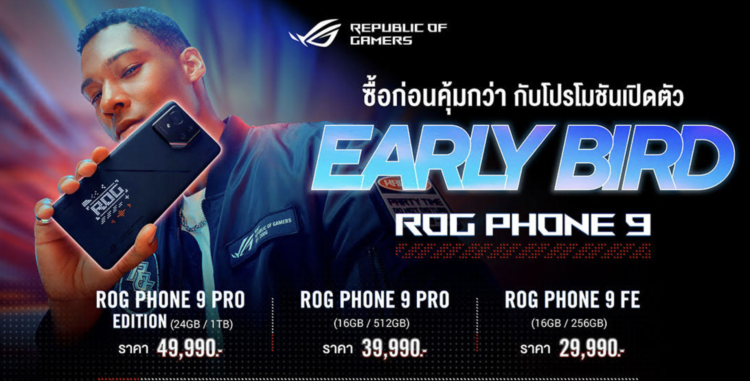 ทั้งนี้ ROG Phone 9 Series พร้อมวางจำหน่ายให้เหล่าเกมเมอร์สเป็นเจ้าของได้แล้ว โดยวางจำหน่าย 3 รุ่น ได้แก่ ROG Phone 9 FE (16GB / 256GB) ราคา 29,990 บาท, ROG Phone 9 Pro (16GB / 512GB) ราคา 39,990 บาท และ ROG Phone 9 Pro Edition (24GB / 1TB) ราคา 49,990 บาท มาพร้อมพัดลม Aero Active Cooler X Pro ในกล่อง ลูกค้าสามารถซื้อสินค้าได้ผ่านทาง AIS, ASUS Online Store, ASUS Official Store บน Lazada และ Shopee, และตัวแทนจำหน่ายชั้นนำทั่วประเทศ พร้อมกับจัดโปรโมชันสุดพิเศษ “Early Bird” ซื้อก่อนคุ้มกว่า โดยมีรายละเอียด ดังนี้