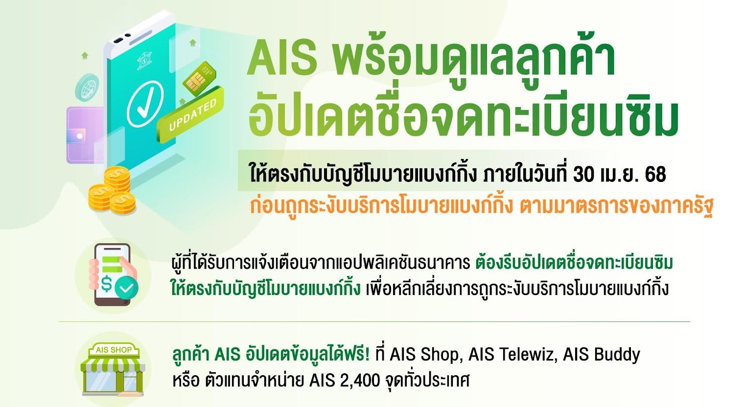 - โดย AIS พร้อมอำนวยความสะดวกให้ลูกค้าที่มีชื่อจดทะเบียนซิมการ์ดไม่ตรงกับชื่อบัญชีโมบายแบงก์กิ้ง ตามที่ได้รับการแจ้งเตือนจากแอปพลิเคชันของธนาคาร สามารถดำเนินการอัปเดตข้อมูลได้ฟรี! ที่ AIS Shop, AIS Telewiz, AIS Buddy หรือ ตัวแทนจำหน่าย AIS ทั่วประเทศ ทั้ง 2,400 จุด โดยไม่มีค่าดำเนินการ