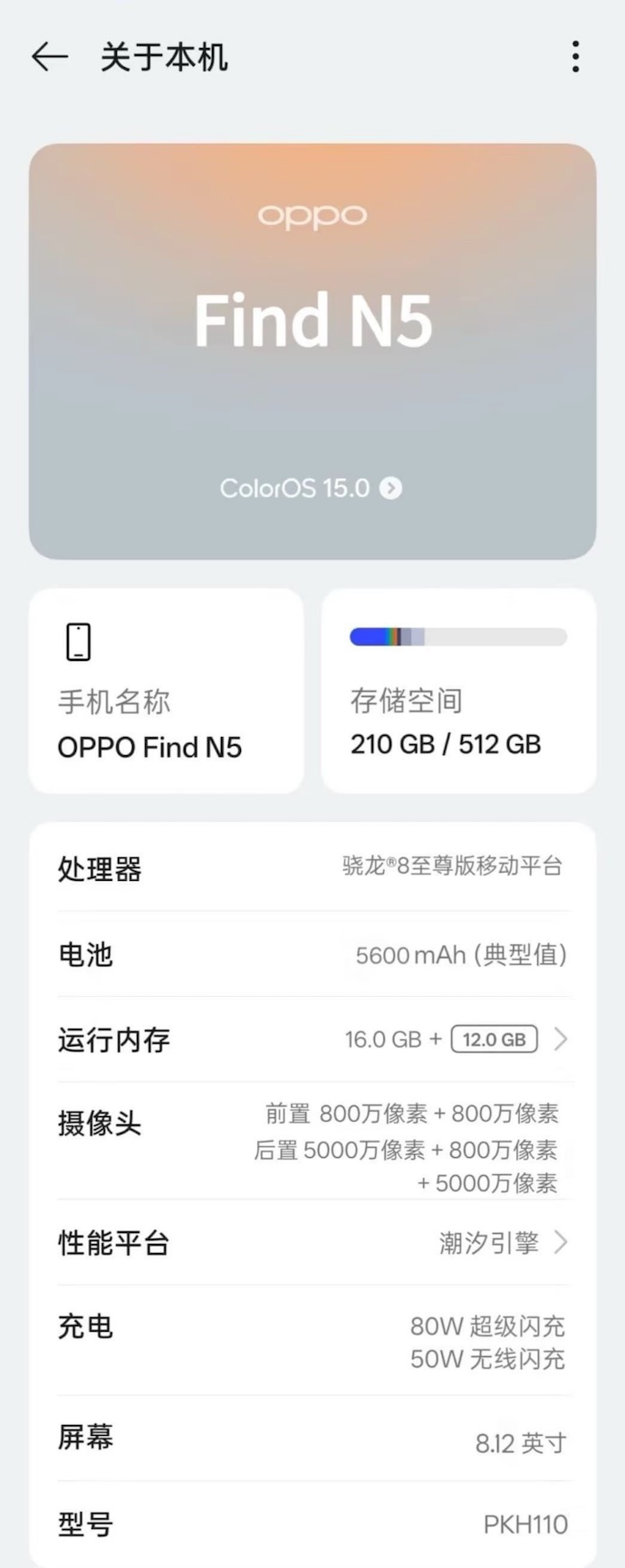 เผยสเปกสมาร์ตโฟนจอพับได้รุ่นใหม่ OPPO Find N5 จากภาพหน้าจอ About Phone ระบุหมายเลขรุ่น PKH110 (เวอร์ชันทำตลาดในจีน) ยืนยันมาพร้อมจอแสดงผล ขนาด 8.12 นิ้ว และใช้ชิปประมวลผล Qualcomm Snapdragon 8 Elite เวอร์ชัน 7-core