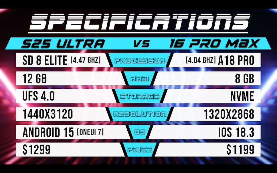ทั้งนี้ Galaxy S25 Ultra ใช้ชิปประมวลผล Snapdragon 8 Elite ความจำ RAM 12GB ขณะที่ iPhone 16 Pro Max มาพร้อมชิป A18 Pro ความจำ RAM 8GB
