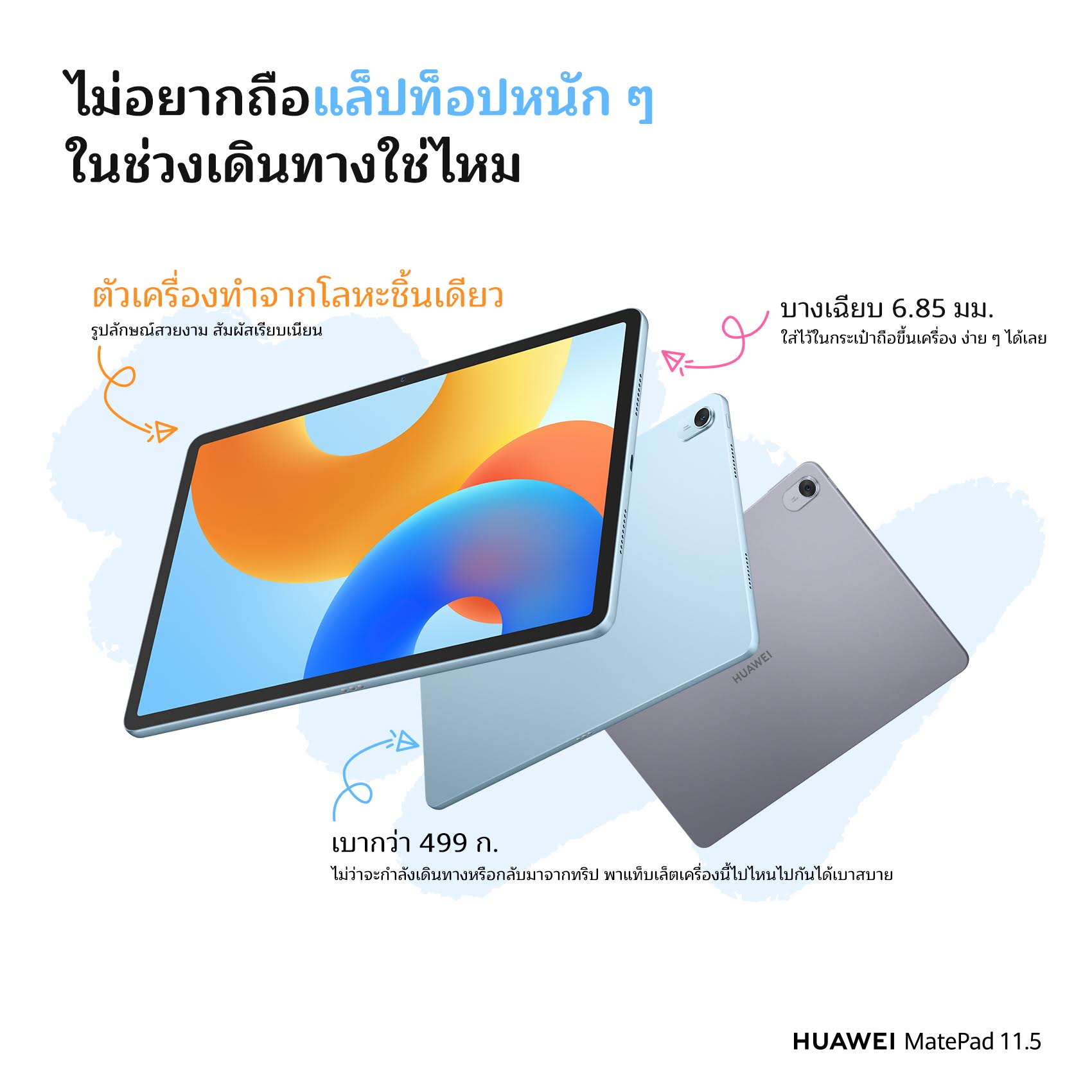 ลองนึกภาพว่าคุณต้องพก แล็ปท็อปหนัก ๆ ไปทำงานที่คาเฟ่ หรือเดินทางไปประชุมต่างจังหวัด ไม่ใช่เรื่องสะดวกเลยใช่ไหม? แต่ HUAWEI MatePad 11.5 NEW ถูกออกแบบให้ บางและน้ำหนักเบา 499 กรัม บางเพียง 6.85 มม. สามารถพกติดกระเป๋าไปได้ทุกที่โดยไม่รู้สึกเกะกะ เชื่อมต่ออุปกรณ์เสริมให้ฟีลเหมือนพีซีด้วยคียบอร์ด HUAWEI Smart Keyboard ให้สัมผัสการพิมพ์แบบพีซีพร้อมปุ่มลัดที่ช่วยให้ทำงานได้เร็วขึ้น ปากกา M-Pen Lite สำหรับจดบันทึกหรือวาดภาพ ทำให้คุณสามารถทำงาน สร้างสรรค์ และเรียนรู้ได้ทุกที่ทุกเวลา นอกจากนั้นยังสามารถเชื่อมต่อกับเมาส์ผ่านบลูทูธเพื่อเพิ่มความสะดวกสบายในการใช้งานได้เหมือนพีซีมากยิ่งขึ้นอีกด้วย