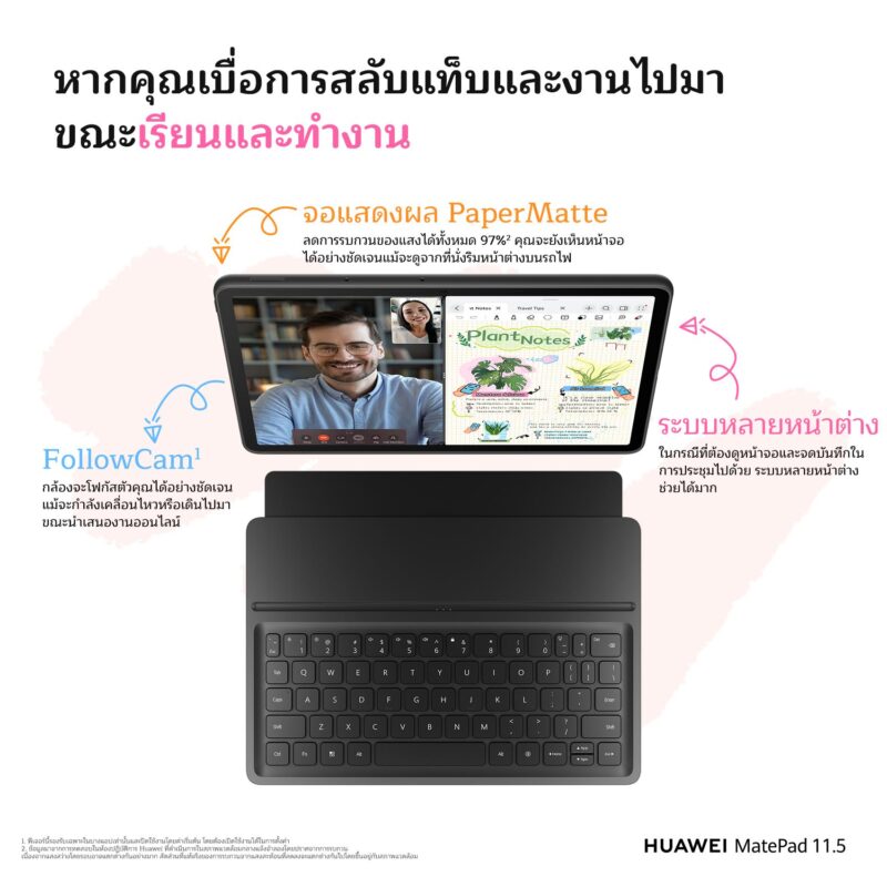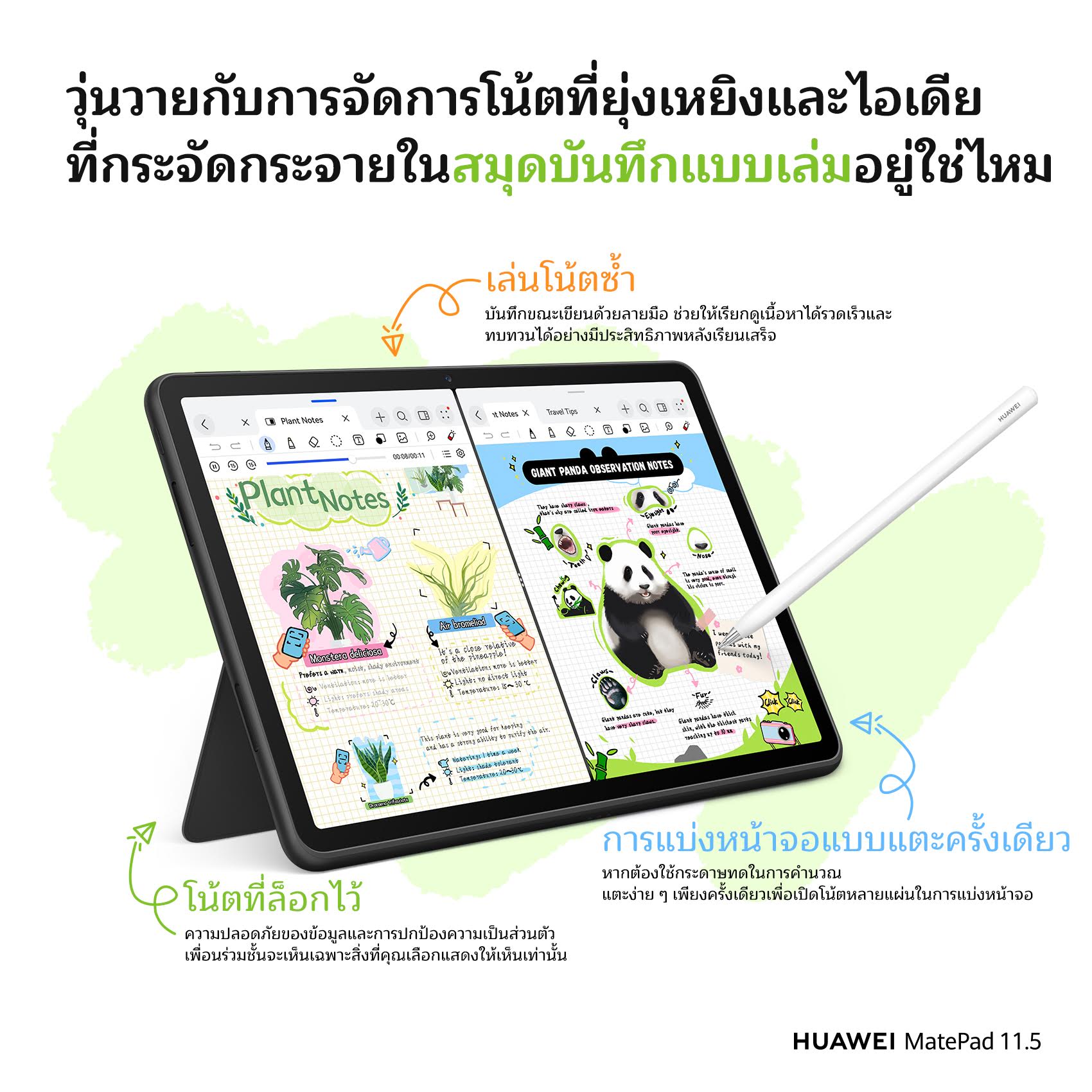 ·      HUAWEI Notes – แอปจดบันทึกอัจฉริยะที่มากกว่ากระดาษ ลืมการพกพาสมุดโน้ตหลายเล่มไปได้เลย! HUAWEI Notes ช่วยให้คุณจดบันทึก วาดไอเดีย หรือทำสรุปงาน ได้ง่าย ๆ ด้วย HUAWEI M-Pen Lite พร้อมฟีเจอร์สุดล้ำที่ช่วยเพิ่มประสิทธิภาพในการจดบันทึก เปิดโน้ตหลายไฟล์พร้อมกัน สลับใช้งานได้สะดวก แยกหน้าจอเพื่อดูและเปรียบเทียบโน้ตได้ง่าย Note Replay – บันทึกเสียงพร้อมจดโน้ต และสามารถแตะข้อความเพื่อเล่นเสียงย้อนหลัง หรือ Handwritten Content Search – ค้นหาข้อความที่เขียนด้วยลายมือได้ทันที3. PaperMatte Display – หน้าจอถนอมสายตา ใช้งานได้ยาวนานหนึ่งในข้อเสียของการใช้พีซีหรือแล็ปท็อปนาน ๆ คือ แสงสะท้อนจากหน้าจอที่ทำให้ตาล้า แต่ HUAWEI MatePad 11.5 NEW มาพร้อมกับ PaperMatte Display เทคโนโลยีหน้าจอลดแสงสะท้อนที่ช่วยให้ใช้งานได้สบายตามากขึ้นแบบ Nanoscale Anti-Glare Etching ลดแสงสะท้อนจากสิ่งแวดล้อม ทำให้หน้าจอคมชัดไม่ว่าอยู่ที่ไหน ไม่ว่าคุณจะใช้งาน กลางแจ้งหรือในที่แสงจ้า ก็หมดกังวลเรื่องการมองเห็น ผ่านการรับรองจาก TÜV Rheinland ด้านการลดแสงสะท้อนและลดความเมื่อยล้าของดวงตา Nanoscale Anti-Glare Etching ลดแสงสะท้อนจากสิ่งแวดล้อม ทำให้หน้าจอคมชัดไม่ว่าอยู่ที่ไหน อีกทั้ง Color Mode ให้ประสบการณ์การอ่านที่สมจริงเหมือนกระดาษ เหมาะสำหรับอ่านหนังสือ เอกสาร หรือการ์ตูน ไม่ว่าคุณจะใช้งาน กลางแจ้งหรือในที่แสงจ้า ก็หมดกังวลเรื่องการมองเห็น แถมยังช่วยถนอมสายตาอีกด้วย!