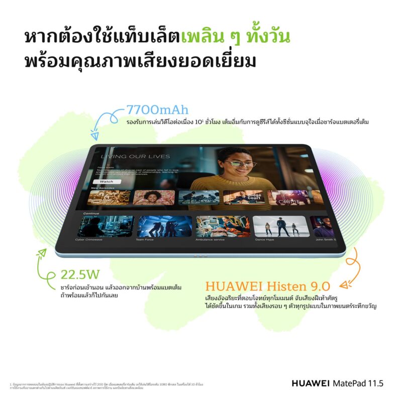 ปัญหาหลักของพีซีและแล็ปท็อปคือ แบตหมดไว และต้องเสียบปลั๊กตลอดเวลา ซึ่งขัดกับไลฟ์สไตล์ยุคใหม่ที่ต้องการ ความอิสระในการใช้งาน แต่HUAWEI MatePad 11.5 NEW มาพร้อมกับแบตเตอรี่ขนาดใหญ่ 7700 mAh[1] ให้เวลาสแตนด์บายนานกว่า 60 วัน และรองรับการเล่นวิดีโอในตัวเครื่องได้นานถึง 10 ชั่วโมง ในด้านประสิทธิภาพการชาร์จ รองรับการชาร์จเร็ว 22.5 W สามารถชารจ์จาก 0% ถึง 100% ในเวลาเพียง 125 นาที[2] ช่วยลดความกังวลเรื่องแบตเตอรี่ของผู้ใช้ ทำงาน เรียน และความบันเทิงได้ต่อเนื่อง – ไม่ว่าคุณจะประชุมออนไลน์ เรียนผ่านวิดีโอ หรือดูหนังยาว ๆ ก็ใช้งานได้โดยไม่สะดุด