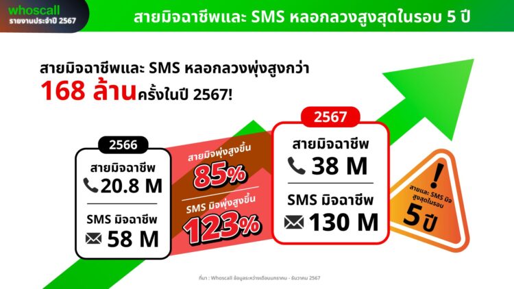 Whoscall เปิดสถิติปี 2567 จำนวนสายมิจฉาชีพทางโทรศัพท์และข้อความ SMS หลอกลวงในไทยพุ่ง 168 ล้านครั้ง สูงสุดในรอบ 5 ปี