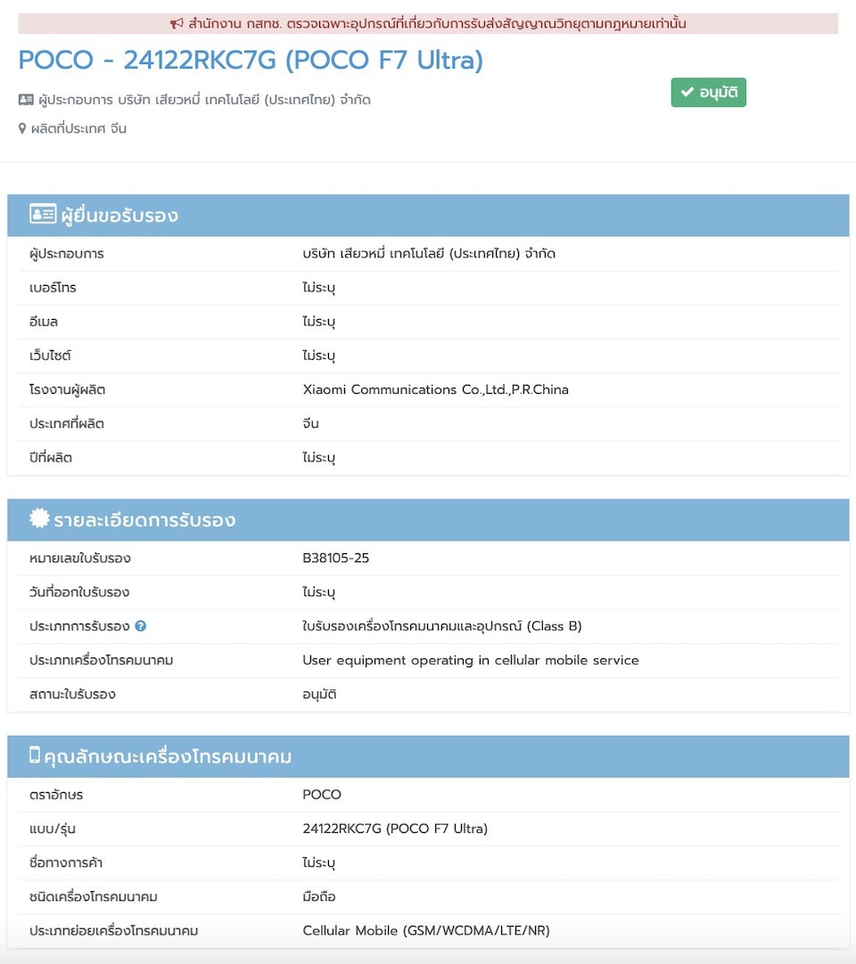 ข้อมูลจาก กสทช. ระบุว่า POCO F7 Ultra ใช้หมายเลขรุ่น 24122RKC7G แต่ไม่ได้ให้รายละเอียดทางเทคนิค