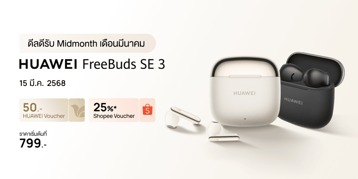 ดีลเด็ดกลางเดือน! ช้อป HUAWEI FreeBuds SE 3 พร้อมส่วนลด 2 ต่อ โค้ดลดสูงสุดถึง 25% ที่ Shopee 15 มีนาคม 2568 นี้เท่านั้น!