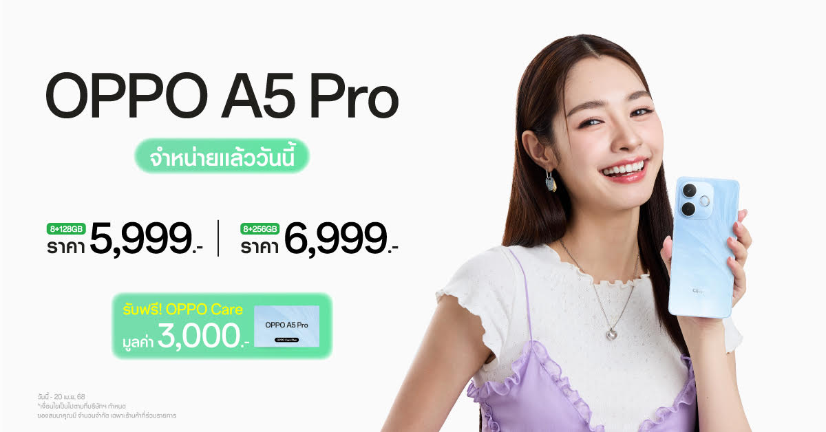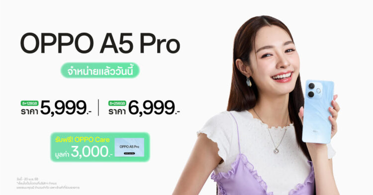 OPPO ประกาศวางจำหน่าย “OPPO A5 Pro” สมาร์ตโฟนสวย ครบ จบทุกดาเมจจากตระกูลซีรีส์ A อย่างเป็นทางการในประเทศไทย สมาร์ตโฟนที่สุดของความทนทานมาพร้อม 2 ความจุ ได้แก่ OPPO A5 Pro (8+128GB) ในราคาเพียง 5,999 บาท และ OPPO A5 Pro (8+256GB) ในราคาเพียง 6,999 บาท พร้อมรับฟรี! OPPO Care มูลค่า 3,000 บาท OPPO A5 Pro พร้อมมอบประสบการณ์ที่สุดของความทนทาน และมาพร้อมความบันเทิงเต็มรูปแบบ จัดเต็มทุกการอัปเกรด ทั้งดีไซน์ คุณภาพ การชาร์จ ประสิทธิภาพ กล้อง และอีกมากมาย ในราคาที่คุ้มค่า