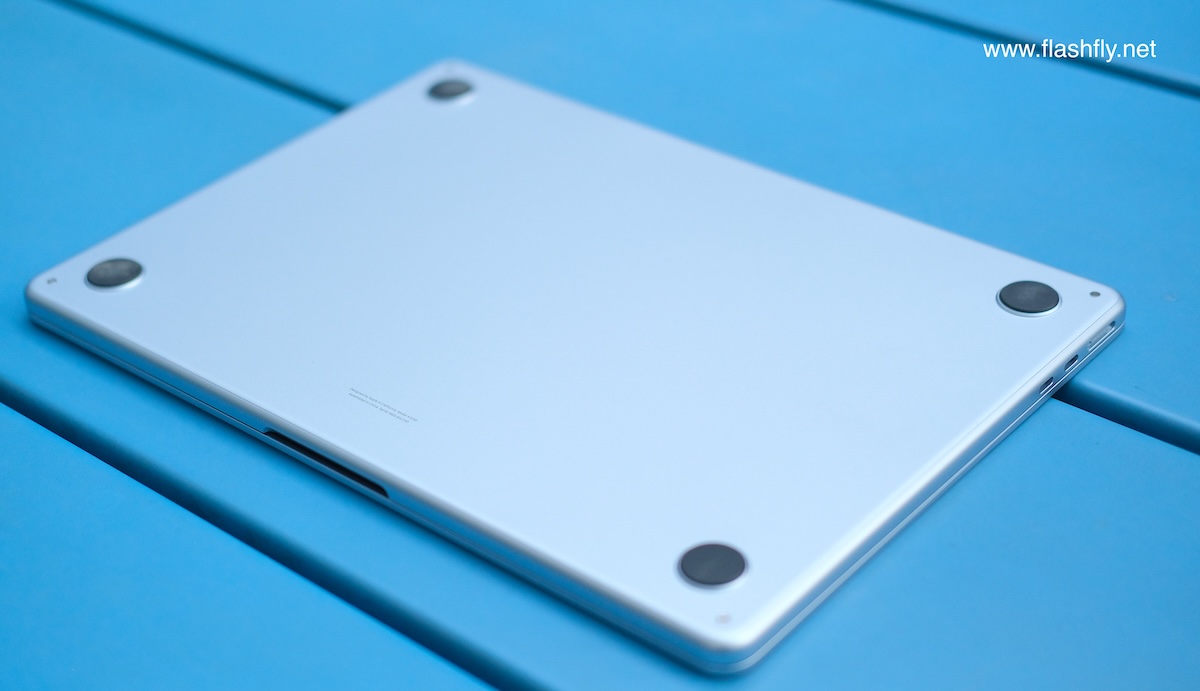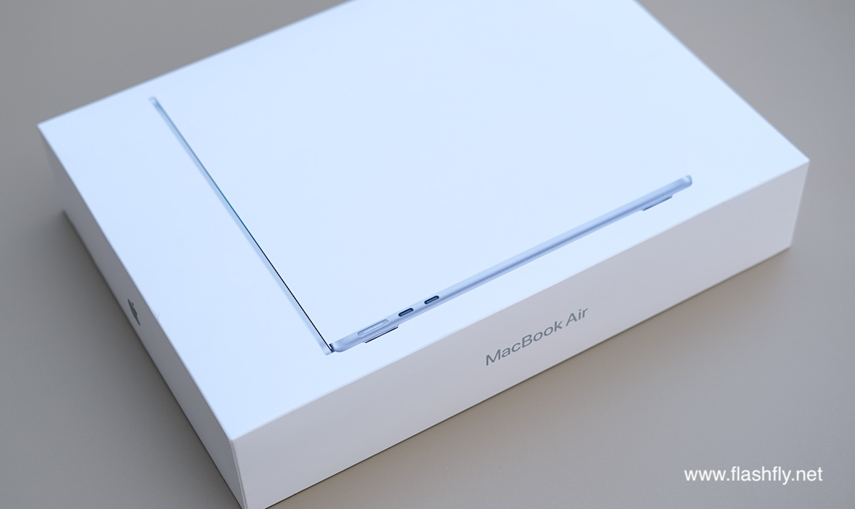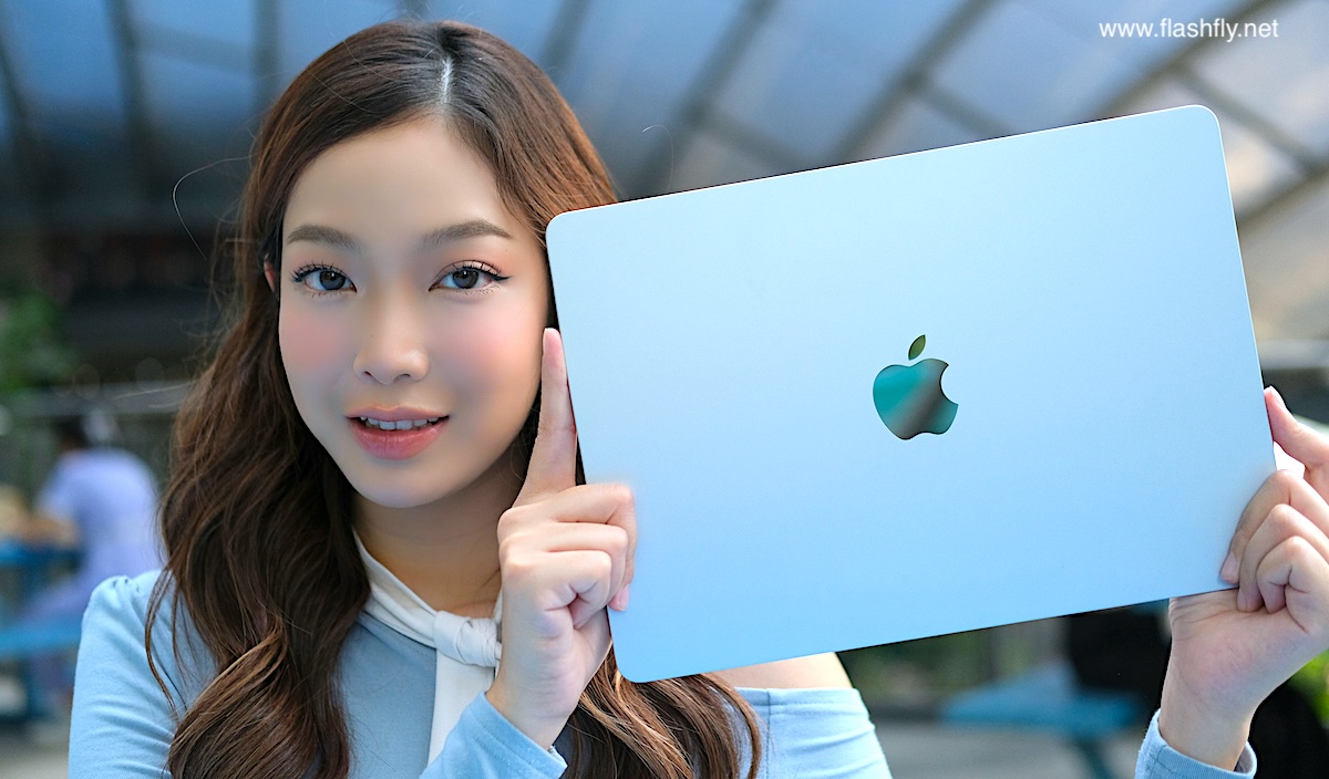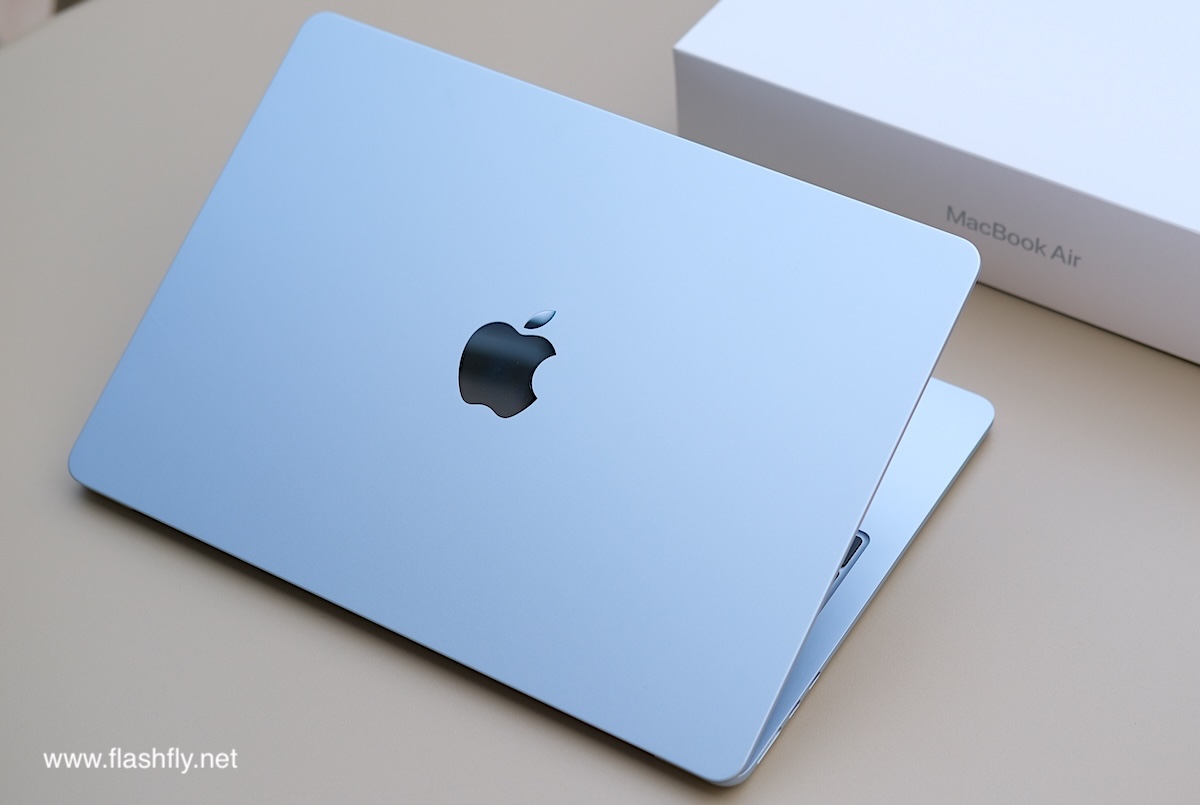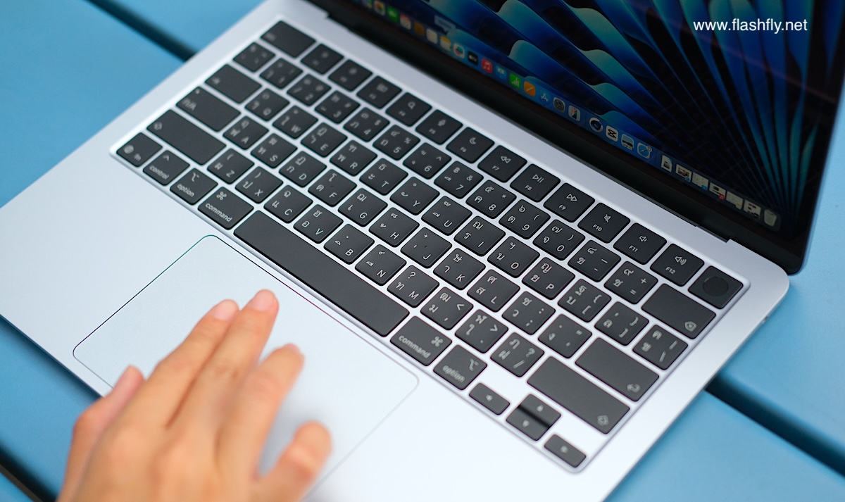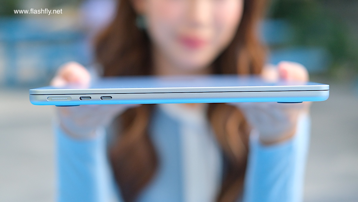 ทีมงาน @flashfly ได้รับ MacBook Air รุ่น 13 นิ้ว สีสกายบลู มารีวิว ซึ่งมาในโทนสีฟ้าอ่อนแบบเมทัลลิก ที่มีพื้นผิวทอประกายเป็นสีสันแบบไล่ระดับแวววาว เมื่อแสงตกกระทบ Apple กล่าวว่าเป็น “สีที่สวยงามราวกับอยู่บนปุยเมฆ” สำหรับดีไซน์โดยรวมของ MacBook Air ได้รับการยกเครื่องครั้งใหญ่ ตั้งแต่รุ่นที่มาพร้อมชิป M2 ซึ่งเปิดตัวในปี 2022 และยังคงรักษาดีไซน์มาจนถึงรุ่นล่าสุด โดยมีจุดเด่นที่ดีไซน์ขอบหน้าจอให้บางลง ทำให้มีรอยบากที่ขอบด้านบน และมาพร้อมพอร์ตชาร์จ MagSafe 3