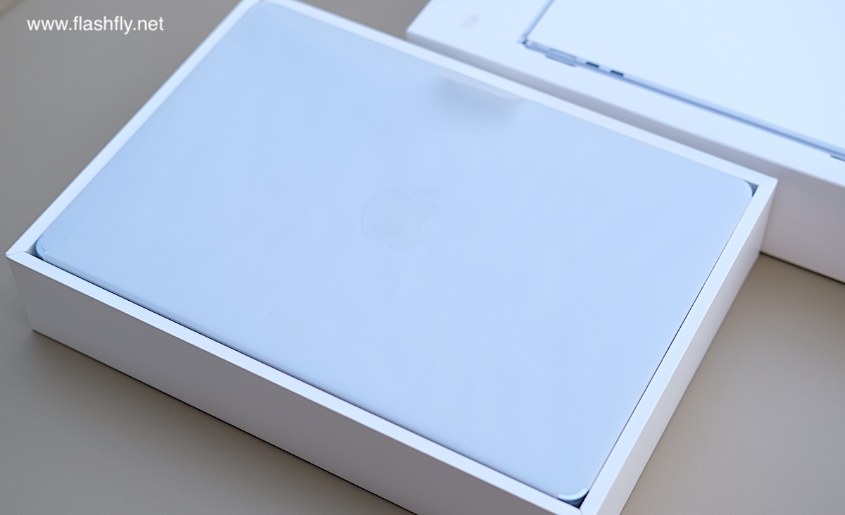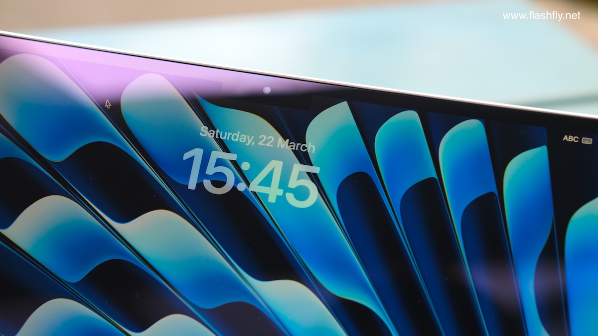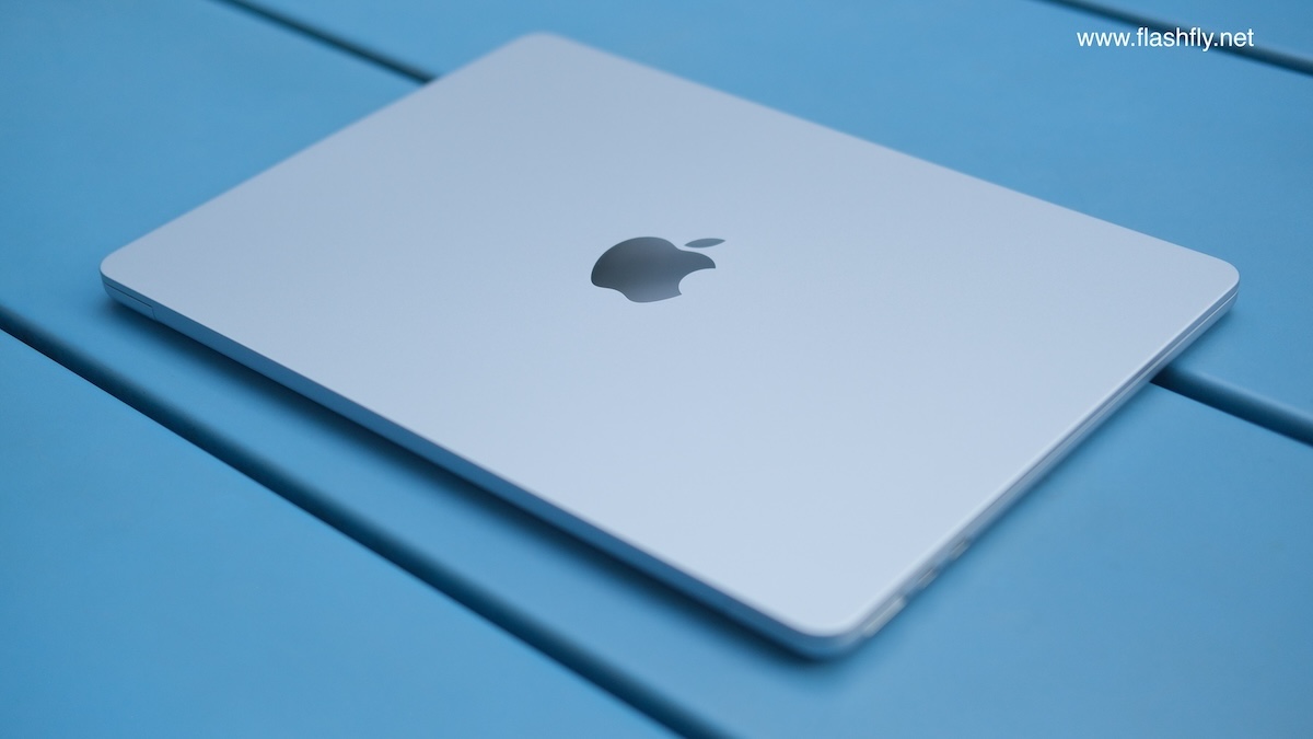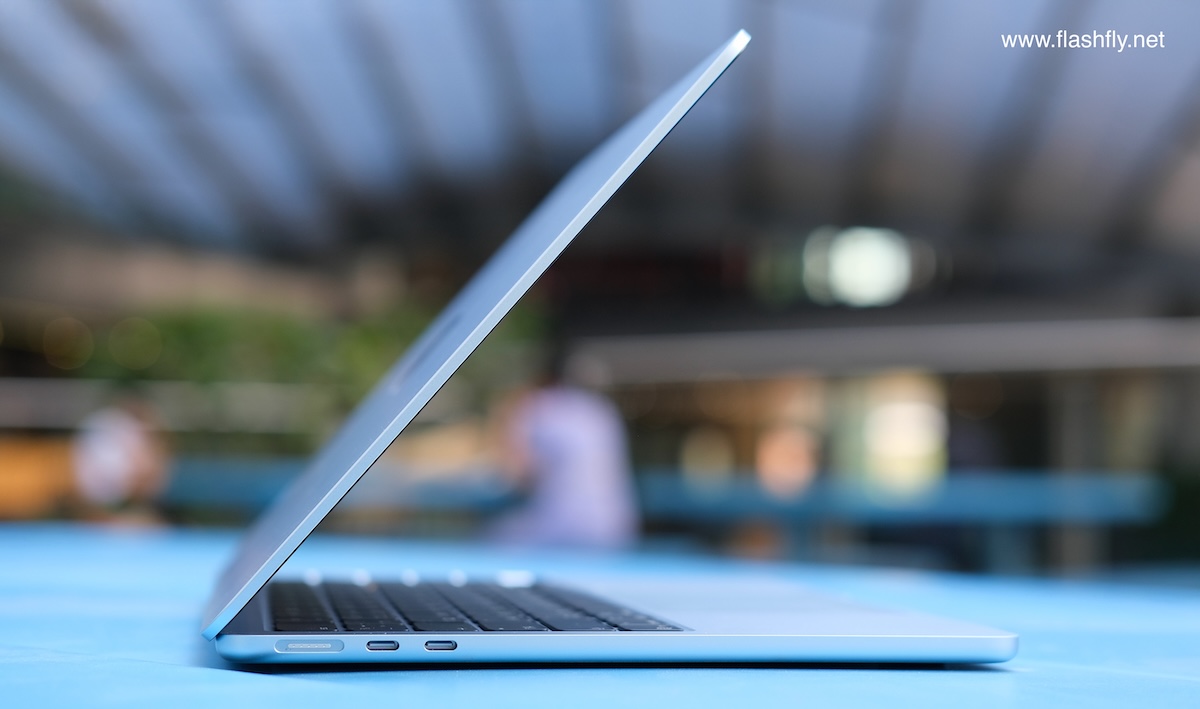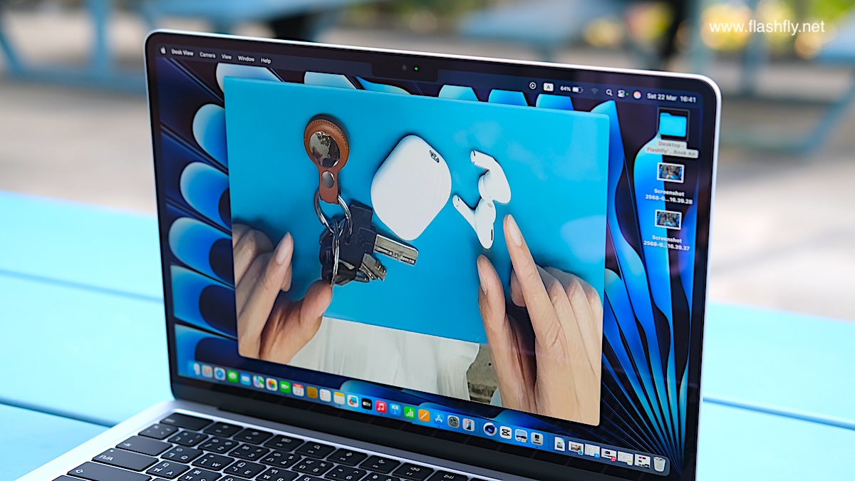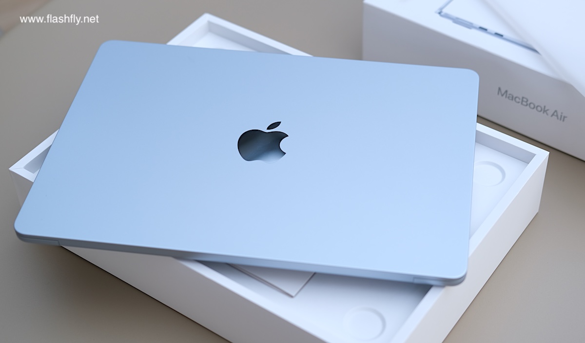 ทีมงาน @flashfly ได้รับ MacBook Air รุ่น 13 นิ้ว สีสกายบลู มารีวิว ซึ่งมาในโทนสีฟ้าอ่อนแบบเมทัลลิก ที่มีพื้นผิวทอประกายเป็นสีสันแบบไล่ระดับแวววาว เมื่อแสงตกกระทบ Apple กล่าวว่าเป็น “สีที่สวยงามราวกับอยู่บนปุยเมฆ” สำหรับดีไซน์โดยรวมของ MacBook Air ได้รับการยกเครื่องครั้งใหญ่ ตั้งแต่รุ่นที่มาพร้อมชิป M2 ซึ่งเปิดตัวในปี 2022 และยังคงรักษาดีไซน์มาจนถึงรุ่นล่าสุด โดยมีจุดเด่นที่ดีไซน์ขอบหน้าจอให้บางลง ทำให้มีรอยบากที่ขอบด้านบน และมาพร้อมพอร์ตชาร์จ MagSafe 3