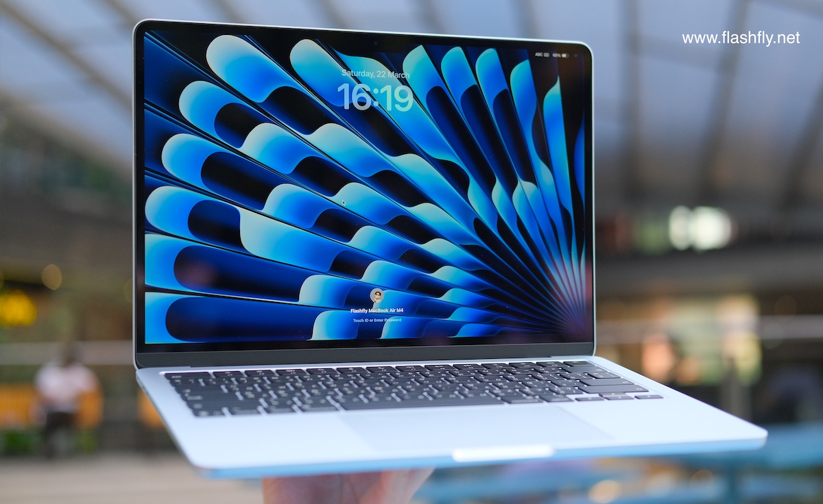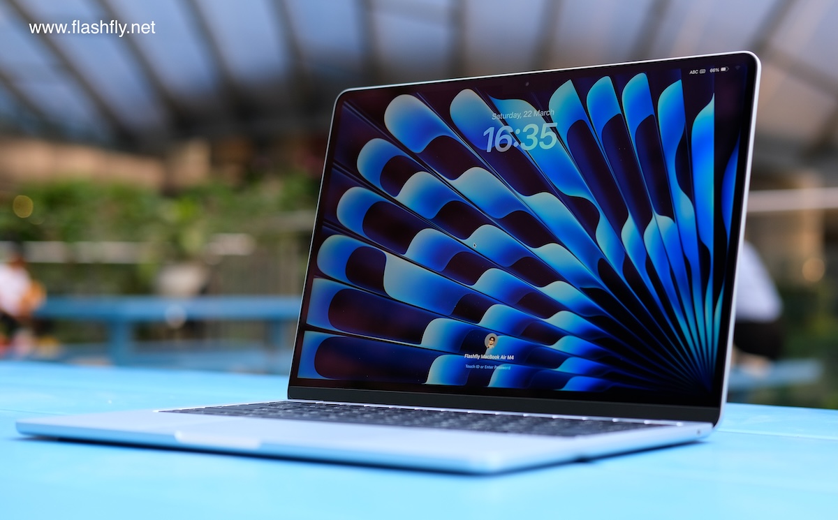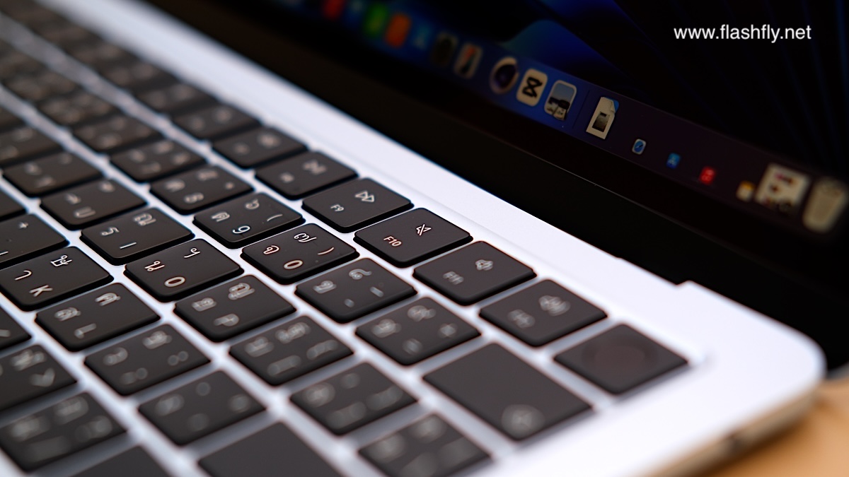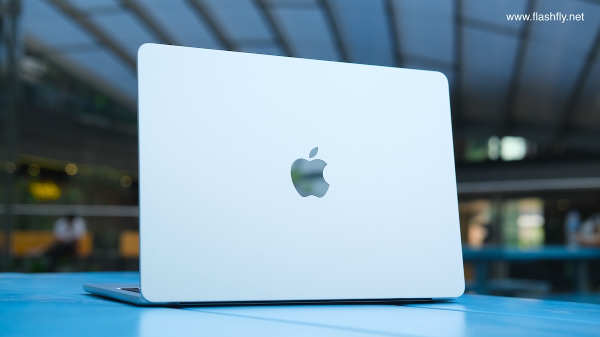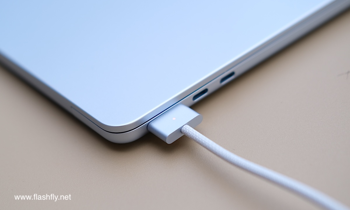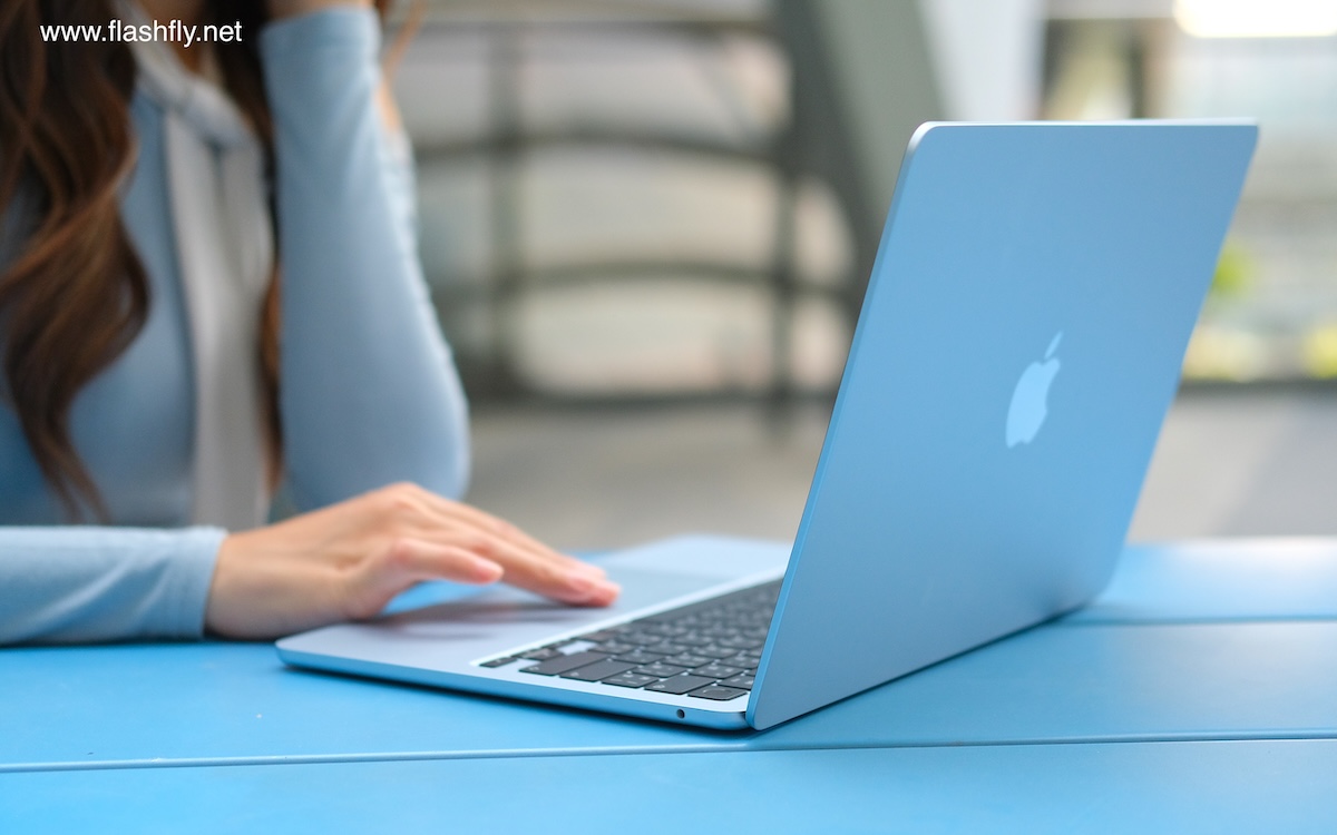 ทีมงาน @flashfly ได้รับ MacBook Air รุ่น 13 นิ้ว สีสกายบลู มารีวิว ซึ่งมาในโทนสีฟ้าอ่อนแบบเมทัลลิก ที่มีพื้นผิวทอประกายเป็นสีสันแบบไล่ระดับแวววาว เมื่อแสงตกกระทบ Apple กล่าวว่าเป็น “สีที่สวยงามราวกับอยู่บนปุยเมฆ” สำหรับดีไซน์โดยรวมของ MacBook Air ได้รับการยกเครื่องครั้งใหญ่ ตั้งแต่รุ่นที่มาพร้อมชิป M2 ซึ่งเปิดตัวในปี 2022 และยังคงรักษาดีไซน์มาจนถึงรุ่นล่าสุด โดยมีจุดเด่นที่ดีไซน์ขอบหน้าจอให้บางลง ทำให้มีรอยบากที่ขอบด้านบน และมาพร้อมพอร์ตชาร์จ MagSafe 3