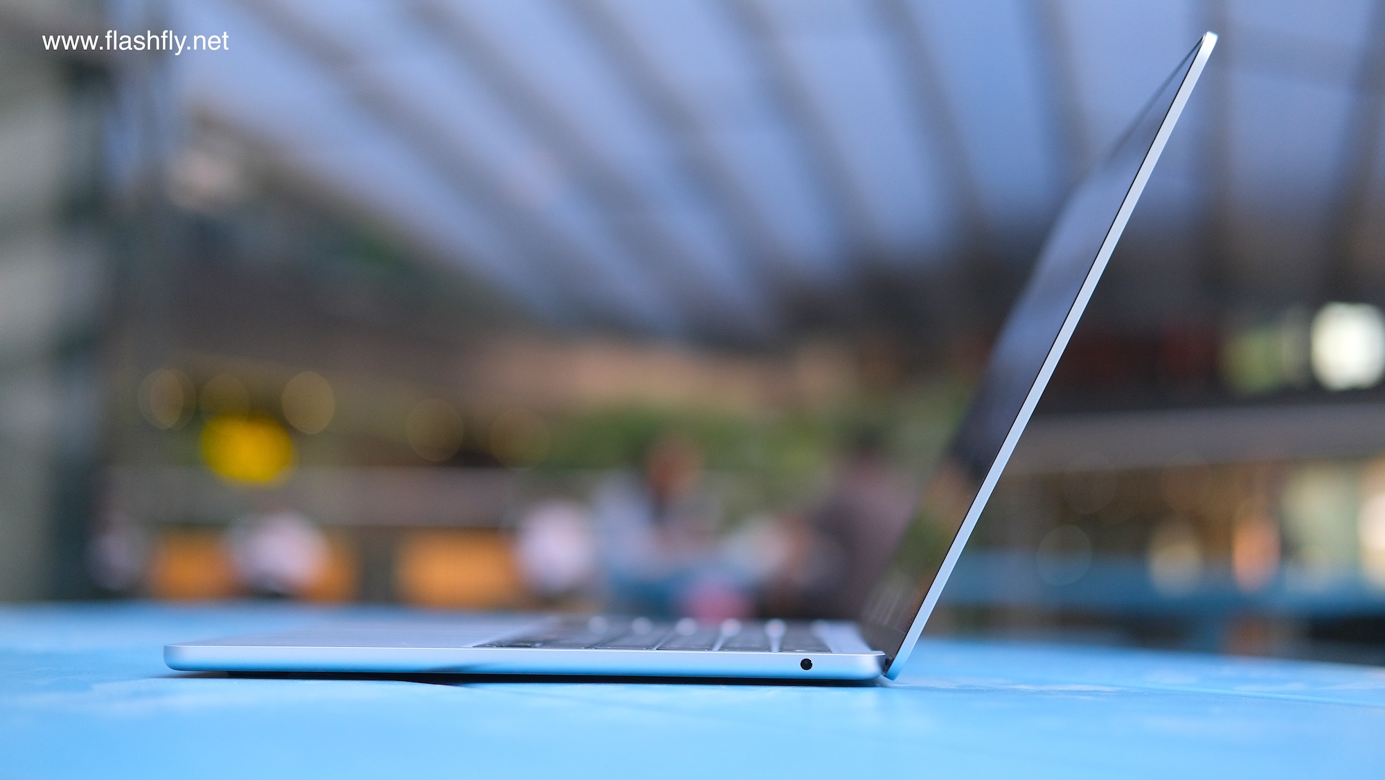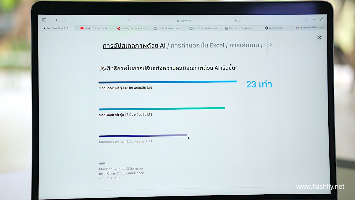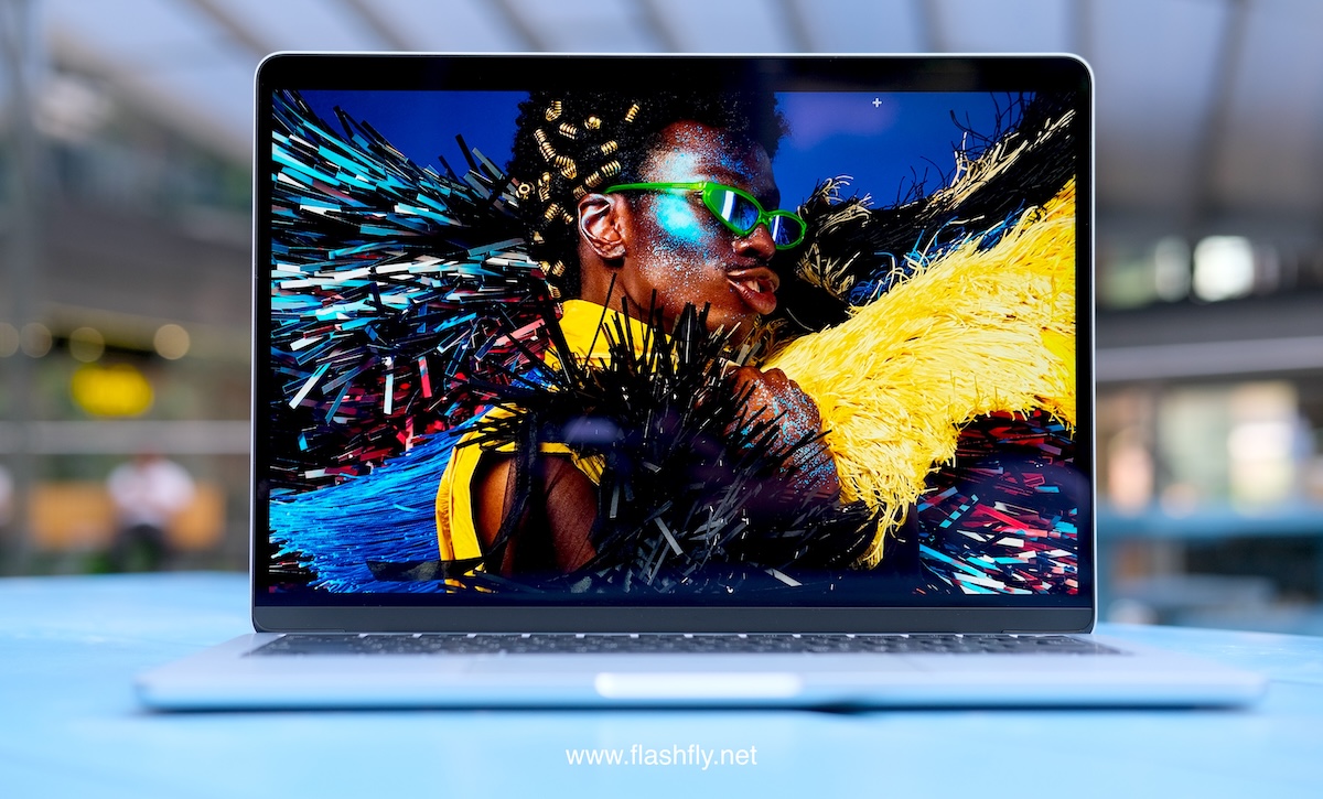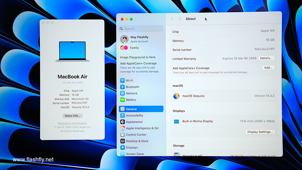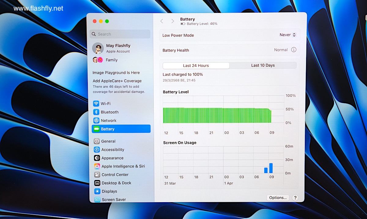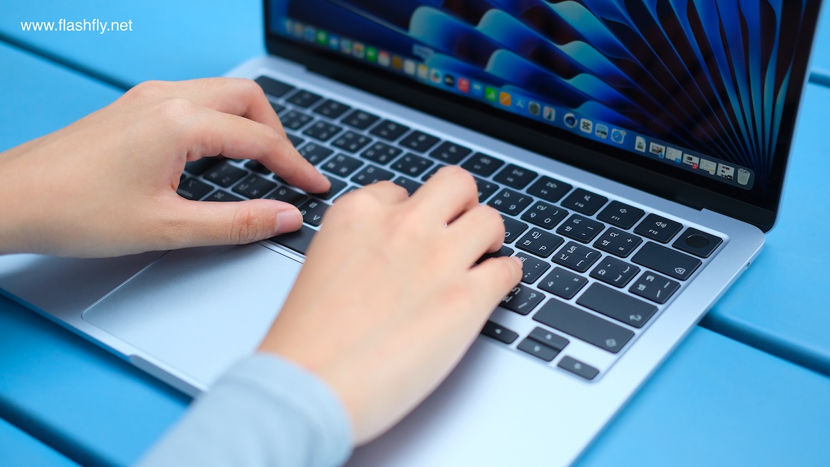ทีมงาน @flashfly ได้รับ MacBook Air รุ่น 13 นิ้ว สีสกายบลู มารีวิว ซึ่งมาในโทนสีฟ้าอ่อนแบบเมทัลลิก ที่มีพื้นผิวทอประกายเป็นสีสันแบบไล่ระดับแวววาว เมื่อแสงตกกระทบ Apple กล่าวว่าเป็น “สีที่สวยงามราวกับอยู่บนปุยเมฆ” สำหรับดีไซน์โดยรวมของ MacBook Air ได้รับการยกเครื่องครั้งใหญ่ ตั้งแต่รุ่นที่มาพร้อมชิป M2 ซึ่งเปิดตัวในปี 2022 และยังคงรักษาดีไซน์มาจนถึงรุ่นล่าสุด โดยมีจุดเด่นที่ดีไซน์ขอบหน้าจอให้บางลง ทำให้มีรอยบากที่ขอบด้านบน และมาพร้อมพอร์ตชาร์จ MagSafe 3