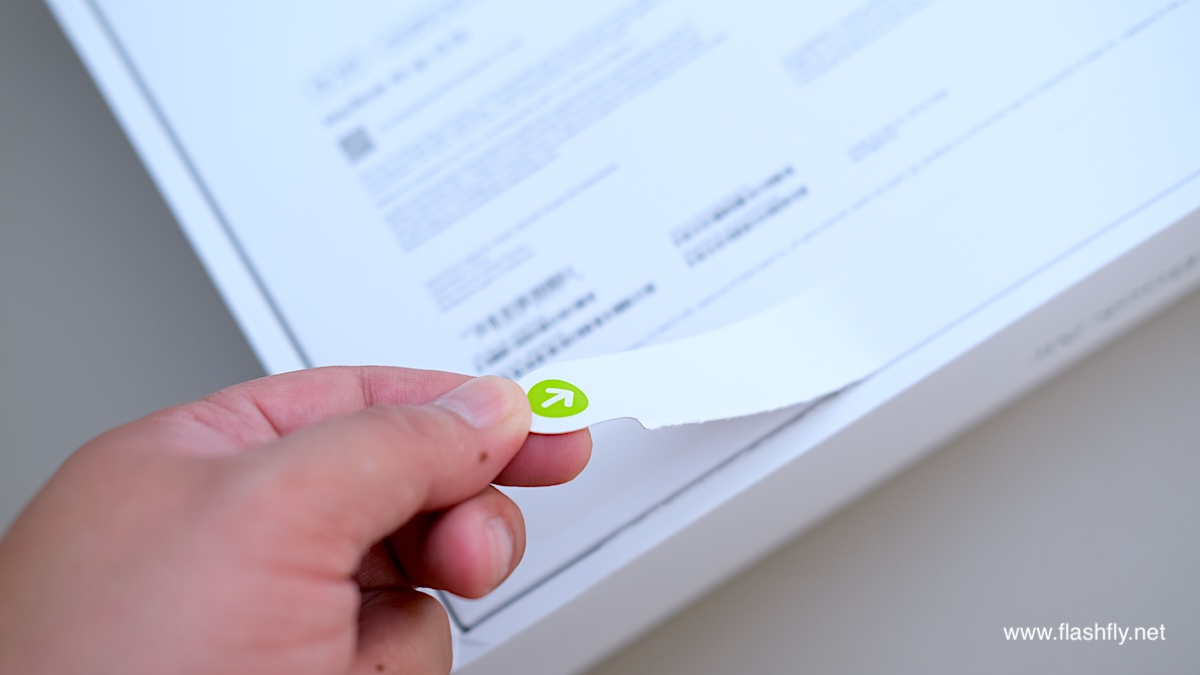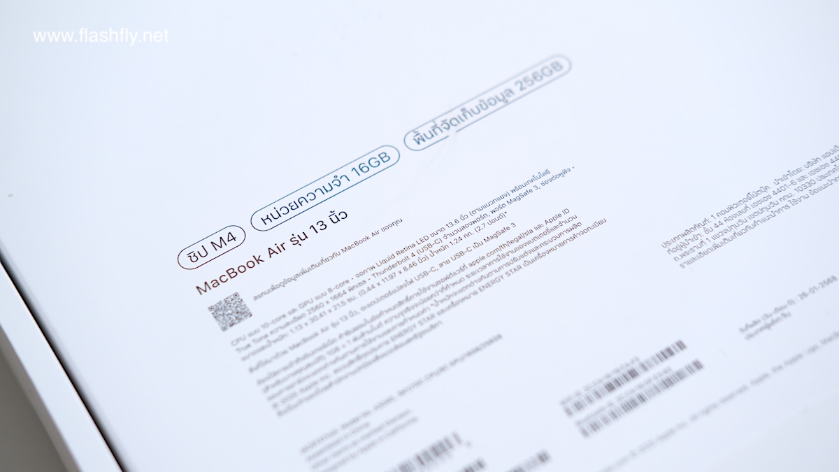 หลังกล่องบอกระบุสเปกหลัก อย่างชิป M4, หน่วยความจำแบบรวม 16GB, พื้นที่จัดเก็บข้อมูล 256GB ซึ่งเป็นรุ่นที่ทีมงาน @flashfly ได้รับมารีวิว ถัดลงมาพิมพ์ชื่อ MacBook Air รุ่น 13 นิ้ว ไว้อย่างชัดเจน ตามด้วย QR Code สามารถสแกนเพื่อดูข้อมูลเพิ่มเติมเกี่ยวกับ MacBook Air รุ่นใหม่ นอกจากนี้ ยังบอกข้อมูลของ CPU, GPU, จอแสดงผล, พอร์ตเชื่อมต่อ, ขนาดตัวเครื่อง, น้ำหนัก รวมถึงอุปกรณ์ภายในกล่อง ส่วนขอบกล่องจะถูกซีลด้วยเทปกาว (ที่ขอบด้านบนกับด้านล่าง) เมื่อลอกออกแล้วก็สามารถยกฝากล่องขึ้นมาได้อย่างง่ายดาย