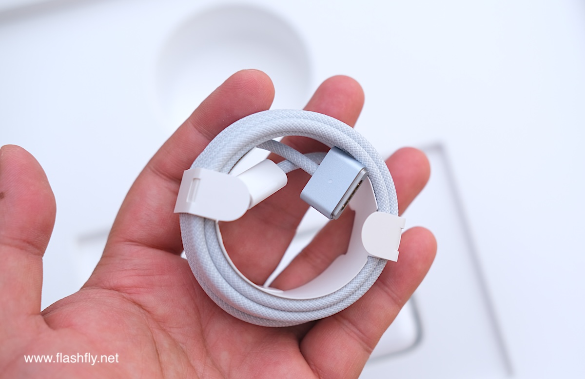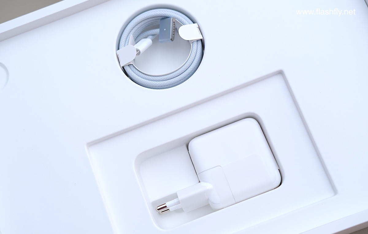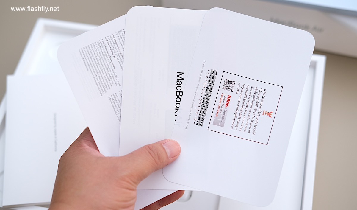 ภายในกล่องจะเห็นว่า MacBook Air รุ่นใหม่ ถูกห่อด้วยซองกระดาษเพื่อป้องกันริ้วรอยระหว่างขนส่ง แถมสาย USB-C เป็น MagSafe 3 (ยาว 2 เมตร) สีเดียวกับตัวเครื่อง พร้อมไฟ LED แสดงสถานะการชาร์จ, หัวชาร์จสีขาว (USB-C Power Adapter) และซองเอกสารสีขาวที่บรรจุคู่มือ, บัตรรับประกัน และ เอกสารยืนยันการรับรองจาก กสทช.