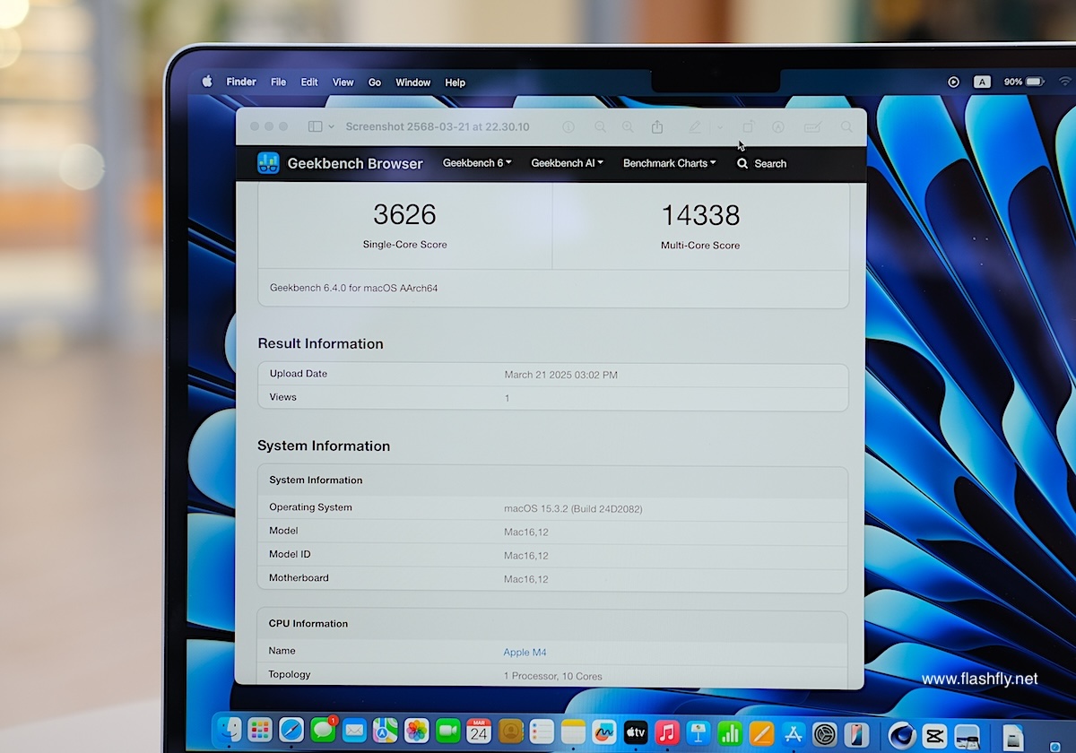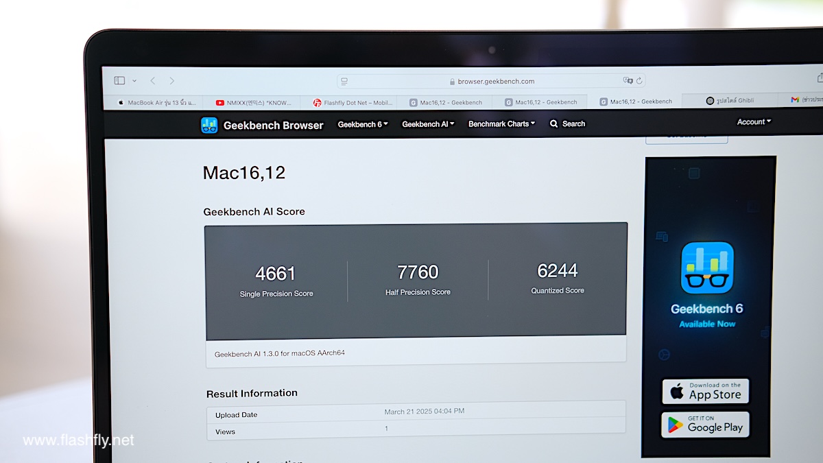 สำหรับการทดสอบประสิทธิภาพ MacBook Air รุ่น 13 นิ้ว ชิป M4 (CPU แบบ 10-core, GPU แบบ 8-core, หน่วยความจำแบบรวม 16GB และ SSD ความจุ 256GB) บนแอป Geekbench ทำได้ 3626 คะแนน ในด้าน Single Core และ 14338 คะแนน ในด้าน Multi Core ขณะที่การทดสอบ Geekbench AI ทำได้ 4661 คะแนน ในด้าน Single Precision, 7760 คะแนน ในด้าน Half Precision และ 6244 คะแนน ในด้าน Quantized