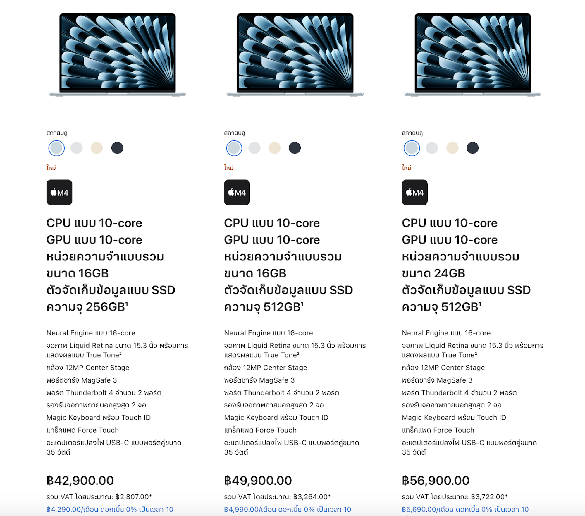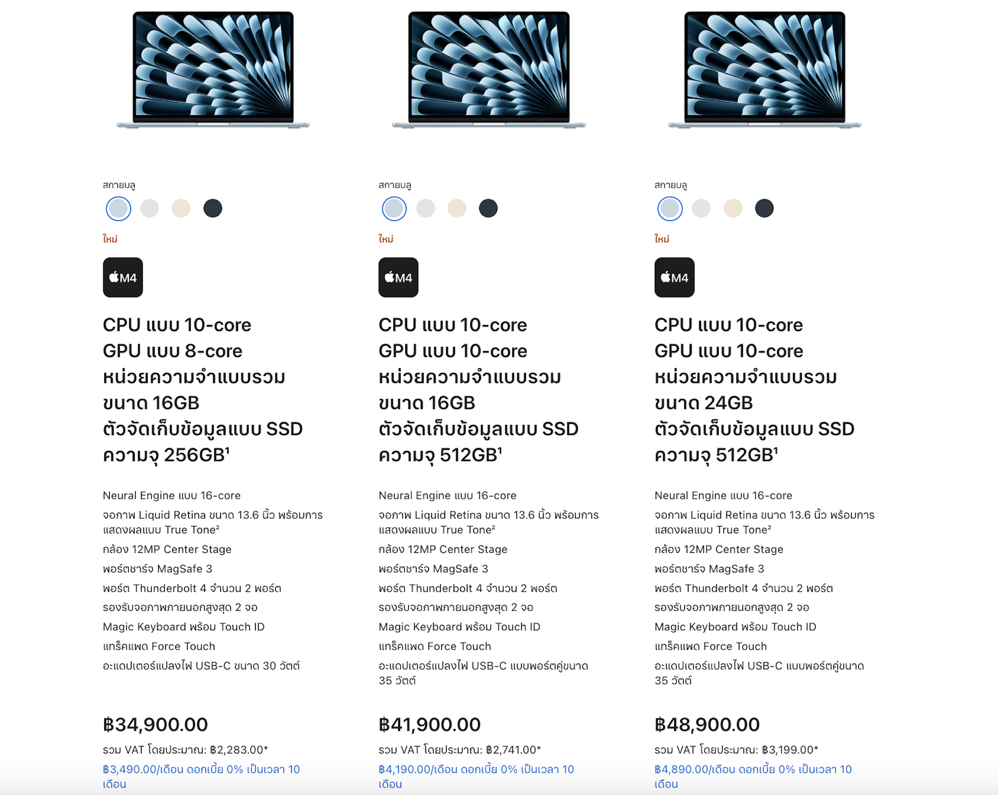 ทั้งนี้ MacBook Air รุ่นชิป M4 พร้อมทำตลาดในประเทศไทยแล้ว โดยมีให้เลือก 2 รุ่น ได้แก่ 13 นิ้ว และ 15 นิ้ว ทั้ง 2 ขนาด มาในสีสกายบลู, สีมิดไนท์, สีสตาร์ไลท์ และ สีเงิน