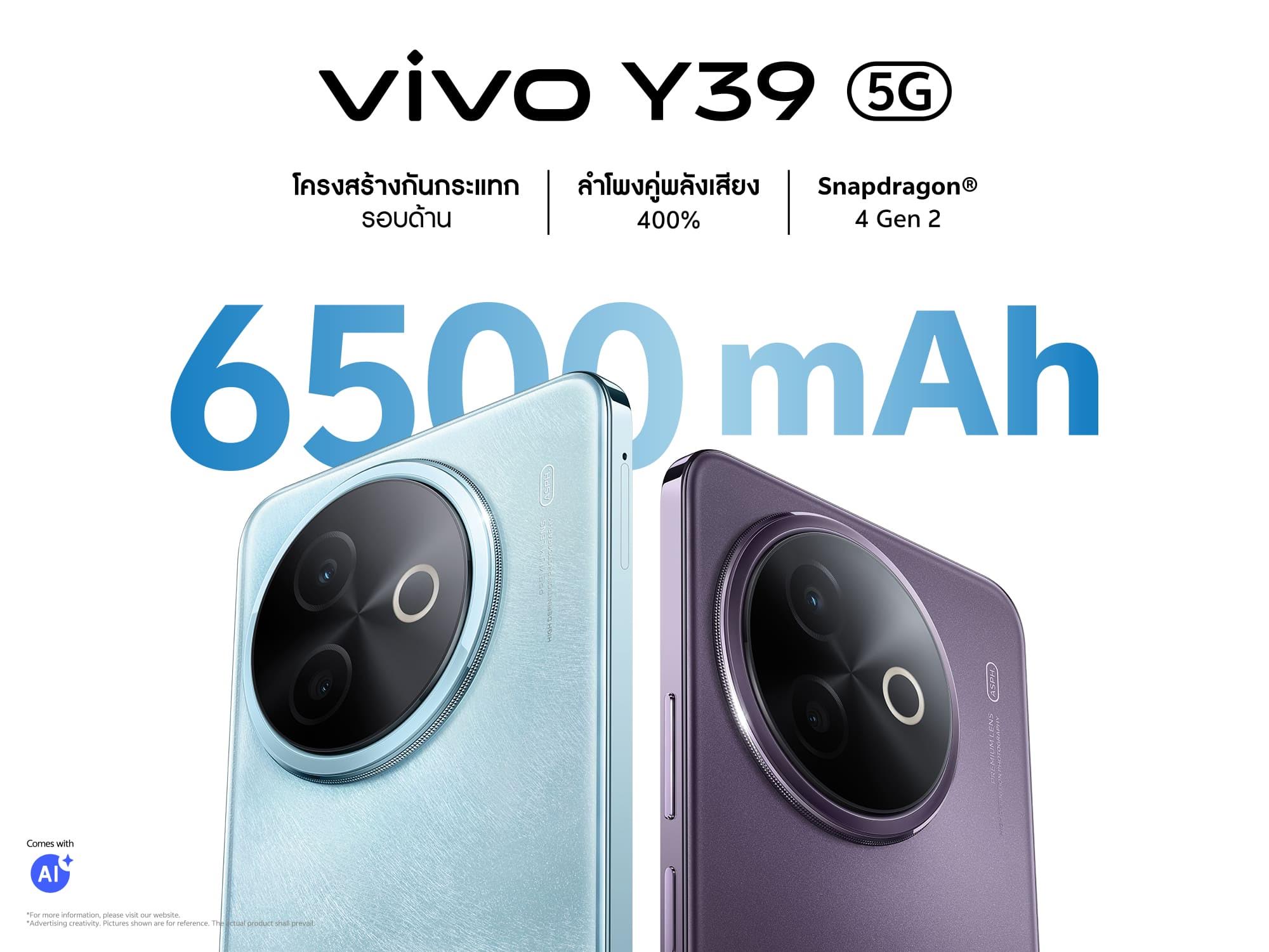 เพื่อตอบโจทย์ทุกไลฟ์สไตล์ที่หลากหลายของคนรุ่นใหม่ vivo เปิดตัวสมาร์ตโฟนน้องเล็ก Y39 5G อย่างเป็นทางการภายใต้แนวคิด “เอาอยู่ทุกความท้าทาย” ด้วยการจัดเต็มความแข็งแกร่งรอบด้าน ไม่ว่าจะเป็นชิปเซ็ตทรงพลังอย่าง Qualcomm Snapdragon® 4 Gen 2 เสริมการใช้งานยาวนานด้วยแบตเตอรี่ BlueVolt บางพิเศษขนาดจุใจ 6500mAh ซึ่งถือว่าใหญ่ที่สุดที่เคยมีใน Y Series ทำงานคู่กับอแดปเตอร์ชาร์จไว 44W และเทคโนโลยี Smart Charging ที่ช่วยถนอมการชาร์จ รับประกันความทนทานด้วยสุขภาพแบตเตอรี่คงเหลือที่ 80% หรือมากกว่าแม้หลังชาร์จ 1,500 ครั้ง ภายใน 5 ปี มาพร้อมระบบระบายความร้อนขนาดใหญ่พิเศษกว่า 30,000 ตร.มม. ให้ผู้ใช้สามารถทำงาน เล่นเกม หรือเพลิดเพลินกับเอนเตอร์เทนเมนต์ได้อย่างไม่สะดุดตลอดวัน