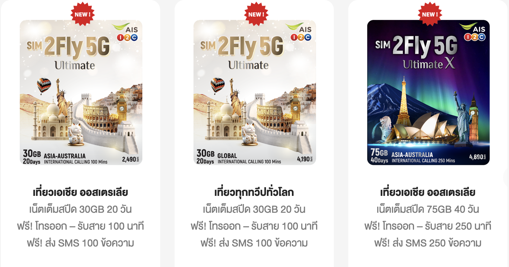 - Ready2Fly Beyond ที่สุดของแพ็กเสริมเน็ตโรมมิ่งสำหรับลูกค้า AIS ครอบคลุมการใช้งานได้มากกว่า 190 กว่าประเทศทั่วโลก ใช้งานอินเทอร์เน็ตบนเครื่องบิน 24 ชั่วโมง เหนือกว่าด้วยเน็ต 100GB โทรออกและรับสายได้ 500 นาที SMS ได้ 500 ข้อความ นานถึง 50 วัน เหมาะสำหรับนักเดินทางที่ต้องการระยะเวลาใช้งานที่ยาวนาน โดยไม่ต้องเติมแพ็กเกจเพิ่มระหว่างการเดินทาง