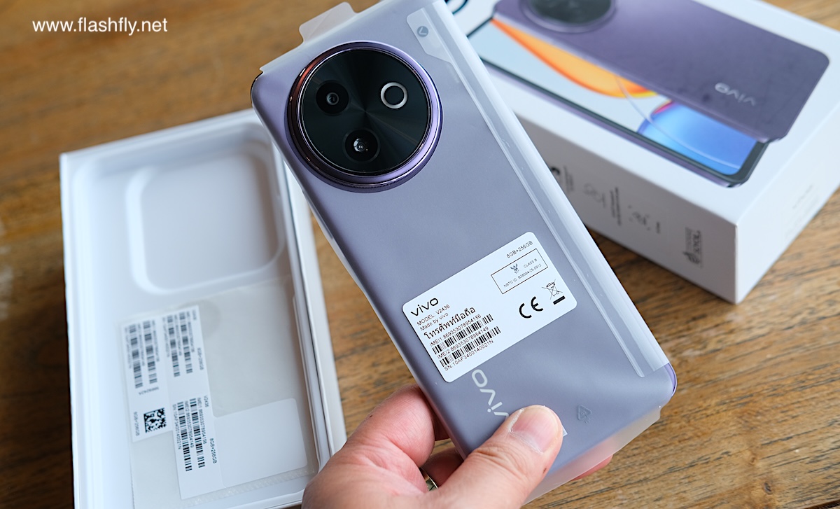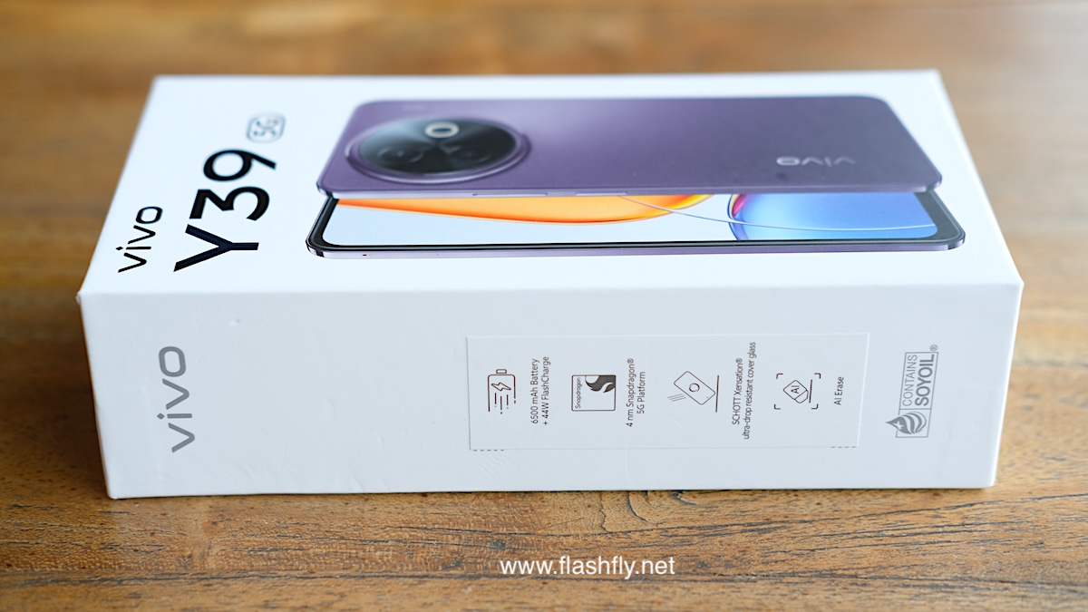 ข้างกล่องบอกจุดเด่นไว้ 3 อย่าง ได้แก่ แบตเตอรี่ BlueVolt 6500mAh รองรับชาร์จเร็ว 44W, ใช้ชิป 5G ของ Snapdragon ระดับ 4nm, ดีไซน์ทนทาน ป้องกันการตกหล่น และ มาพร้อมฟีเจอร์ AI Erase นอกจากนี้ ยังระบุว่าข้อความต่างๆ บนตัวกล่อง ถูกพิมพ์ด้วยหมึกน้ำมันถั่วเหลือง แสดงถึงความใส่ใจสิ่งแวดล้อม อีกข้างของกล่องมีวงกลม 2 วง ประกอบด้วยสีฟ้า และ สีม่วง ซึ่งเป็นสีสันของ vivo Y39 5G ที่มีให้เลือก 2 สี ได้แก่ Ocean Blue และ Galaxy Purple