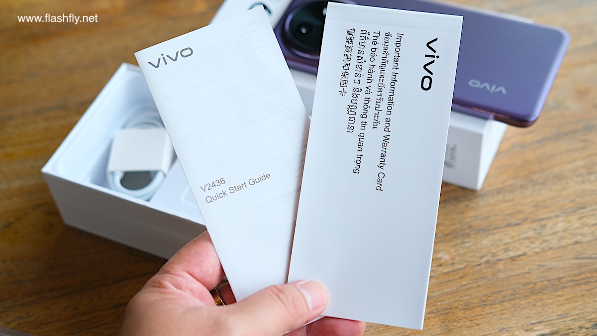 เมื่อยกฝากล่องขึ้นมา จะพบกับสมาร์ตโฟนเป็นอย่างแรก โดยมีแผ่นพลาสติกพันไว้ เพื่อป้องกันริ้วรอยระหว่างขนส่ง เมื่อแกะซองออกไป จะเห็นว่า vivo Y39 5G ได้รับการติดฟิล์มกันรอยหน้าจอมาให้แล้ว
