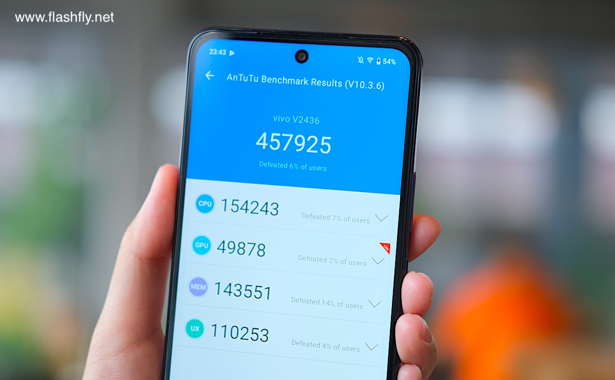 จากการทดสอบประสิทธิภาพบนแอปพลิเคชัน AnTuTu พบว่า vivo Y39 5G ทำได้ 457925 คะแนน โดยจำแนกเป็นคะแนนด้าน CPU ทำได้ 154243 คะแนน, GPU ได้รับ 49878 คะแนน, Memory ทำได้ 143551 คะแนน และด้าน User Experience มี 110253 คะแนน