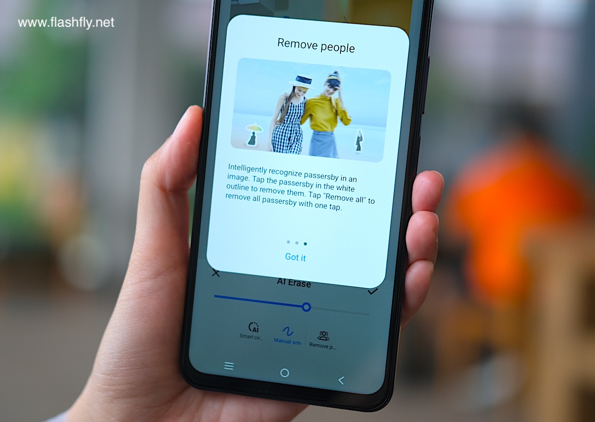 AI Erase ช่วยลบสิ่งรบกวนบนภาพถ่ายออกไป พร้อมเติมพื้นหลังอัตโนมัติ เหมือนไม่เคยมีสิ่งนั้นอยู่บนภาพถ่ายมาก่อน ไม่ว่าจะเป็นวัตถุ หรือ คนที่เดินผ่านกล้อง